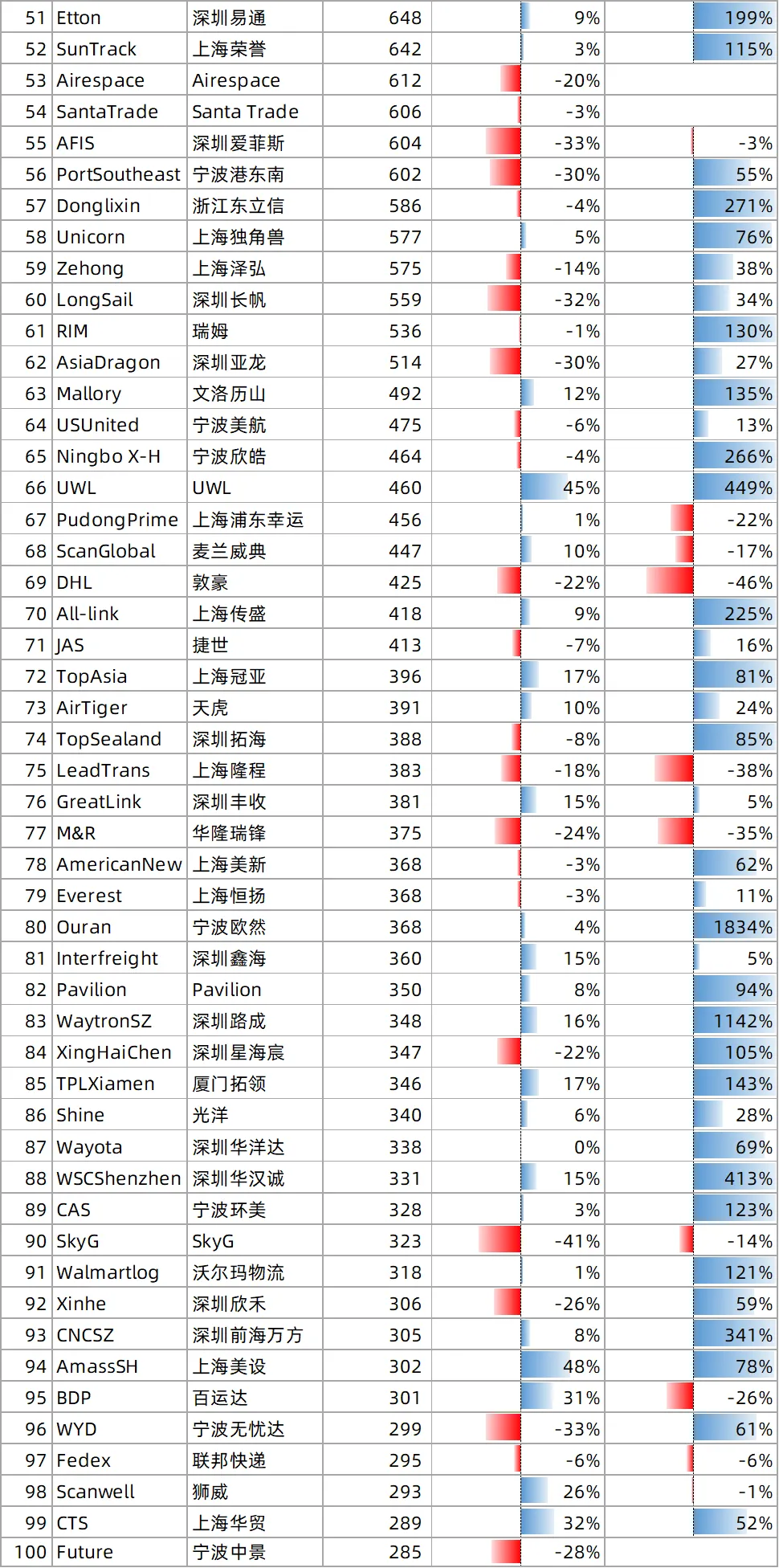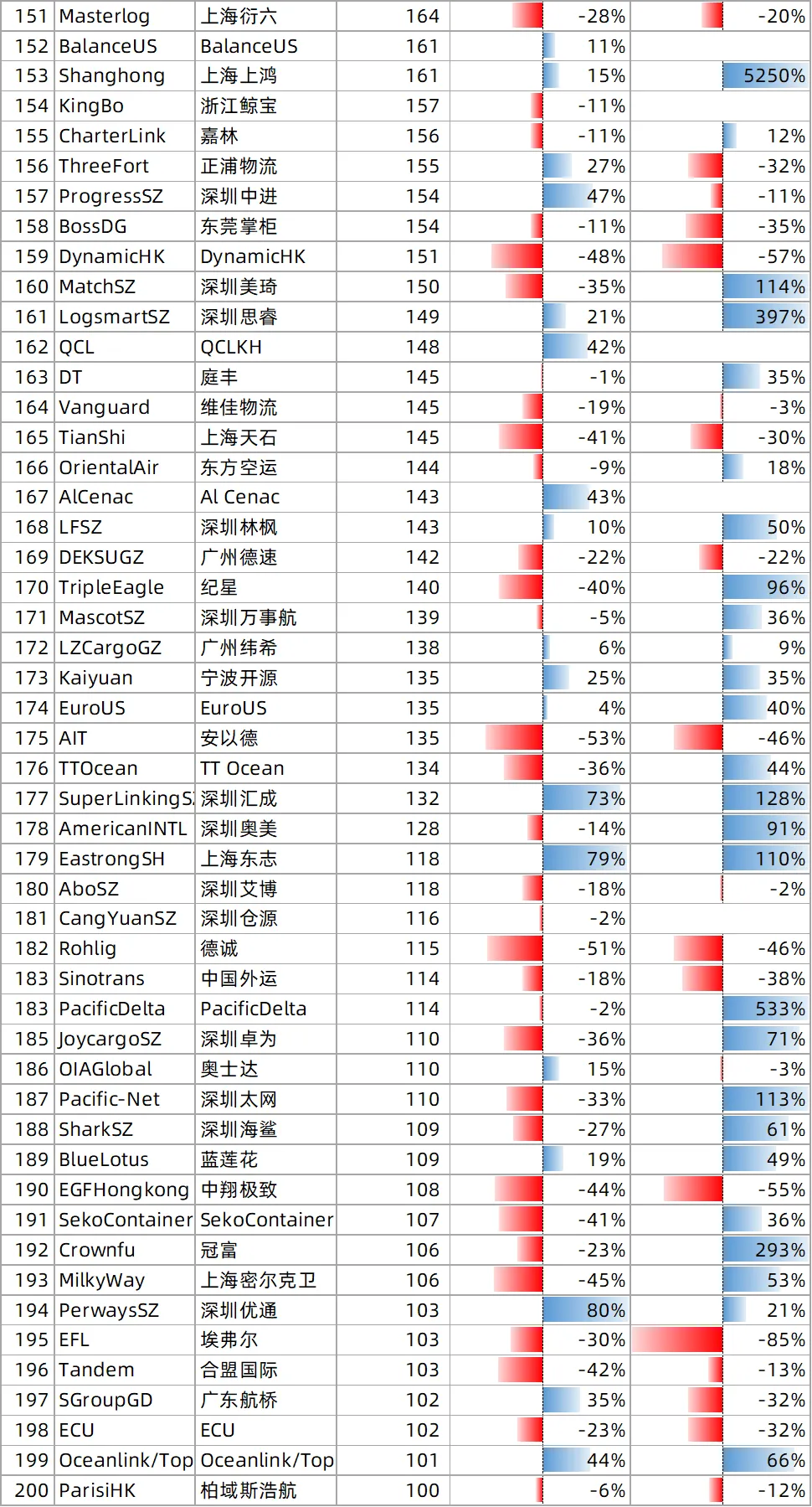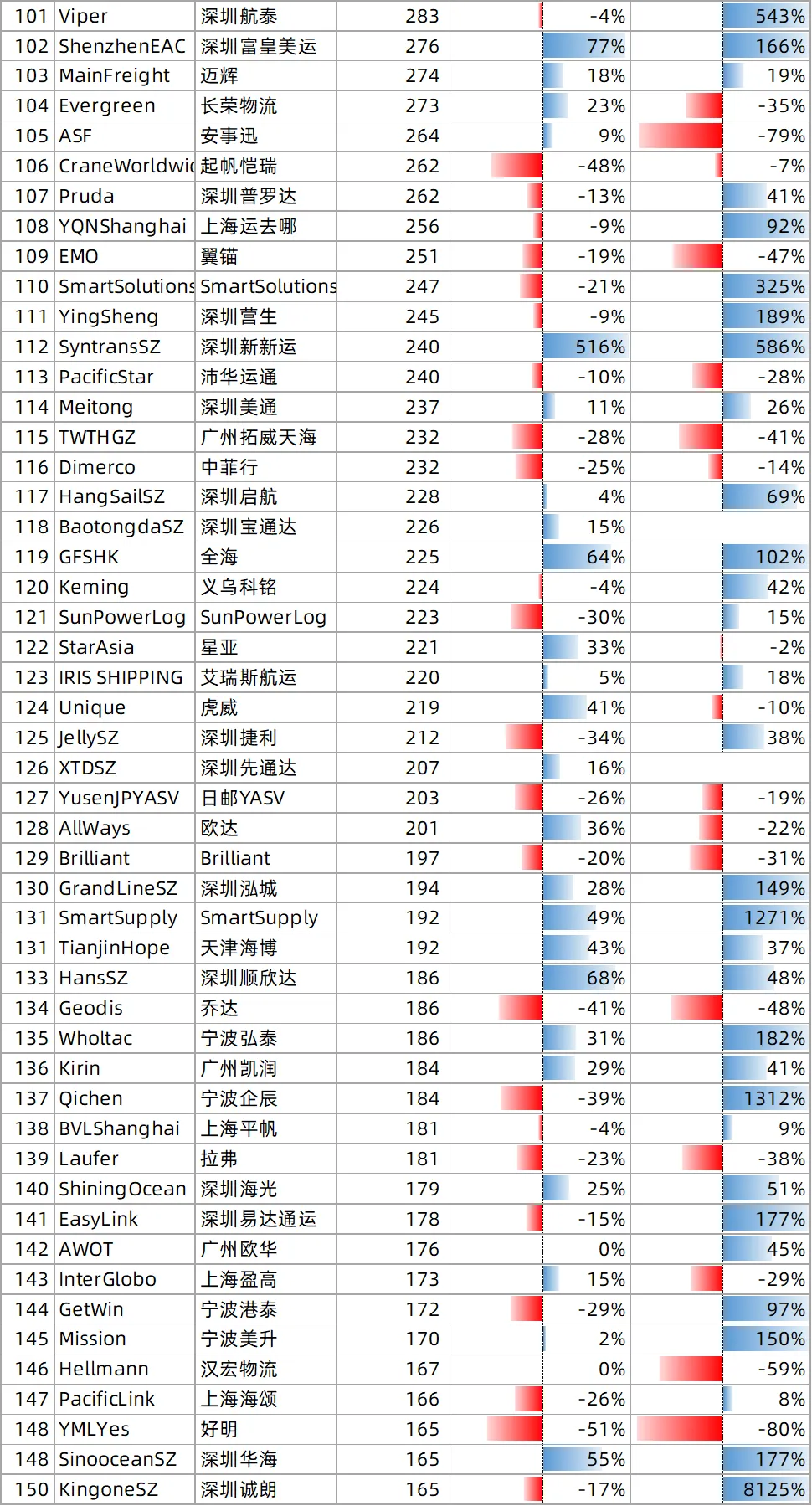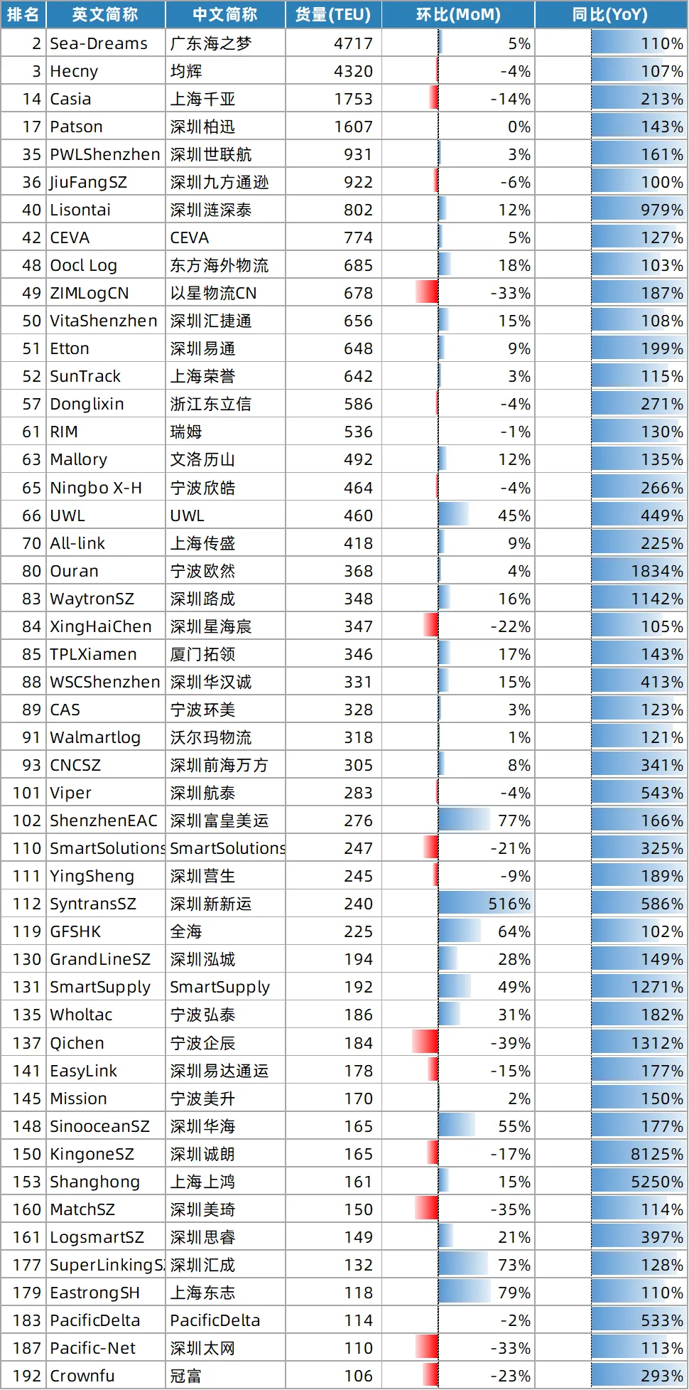 🔹 “轻舟快船,各显神通”:多数货代月货量在300 TEU以下,弹性十足。宁波欧然(368 TEU,+1834%)、深圳路成(348 TEU,+1142%)如快艇突围,深圳涟深泰(802 TEU,+979%)在中等体量下实现“大象起舞”