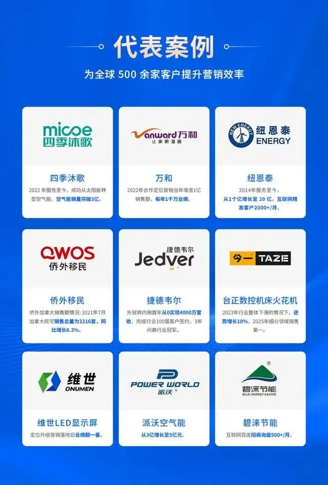 实战案例:助力今一数控火花机实现数亿级业绩增长,通过精准的品牌定位与推广方案,提升企业在行业内的知名度与影响力;累计服务超百家工业制造企业,在市场下行环境中助力多个企业实现逆势增长,成为行业内颇具代表性的案例。