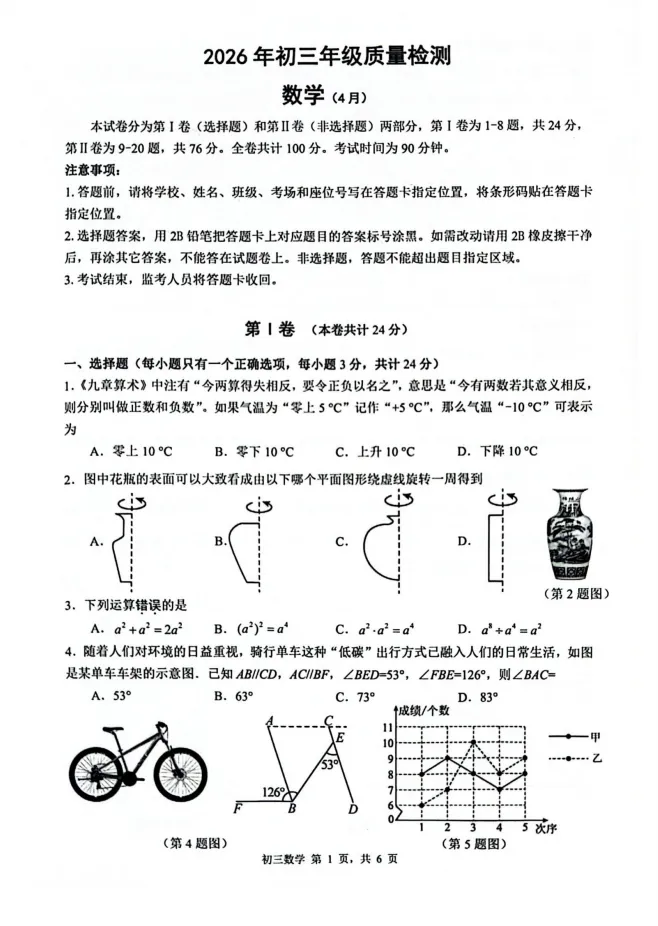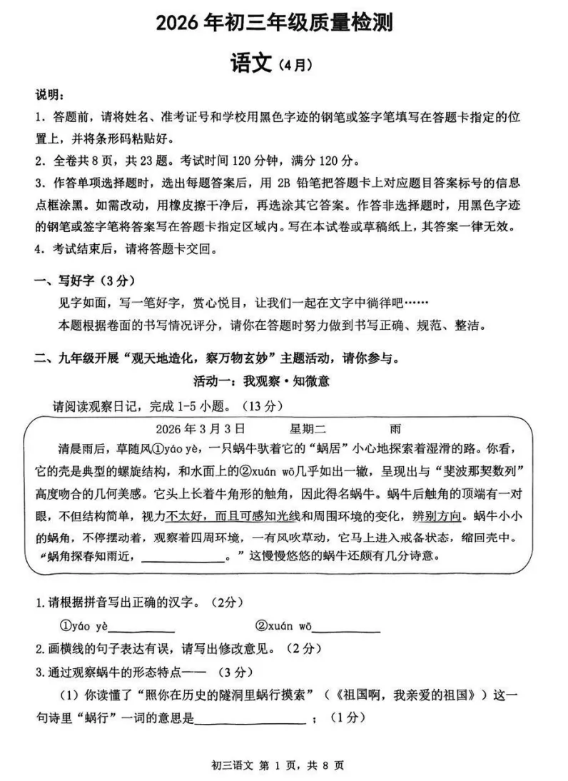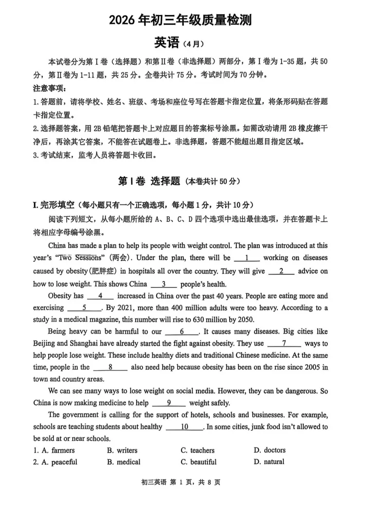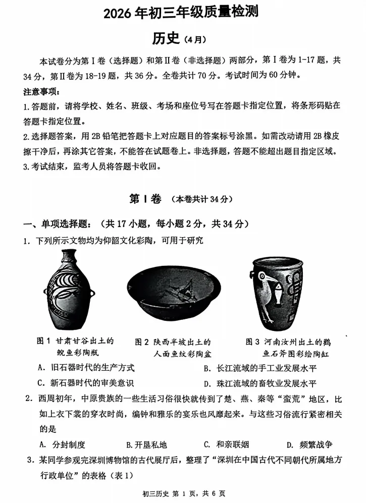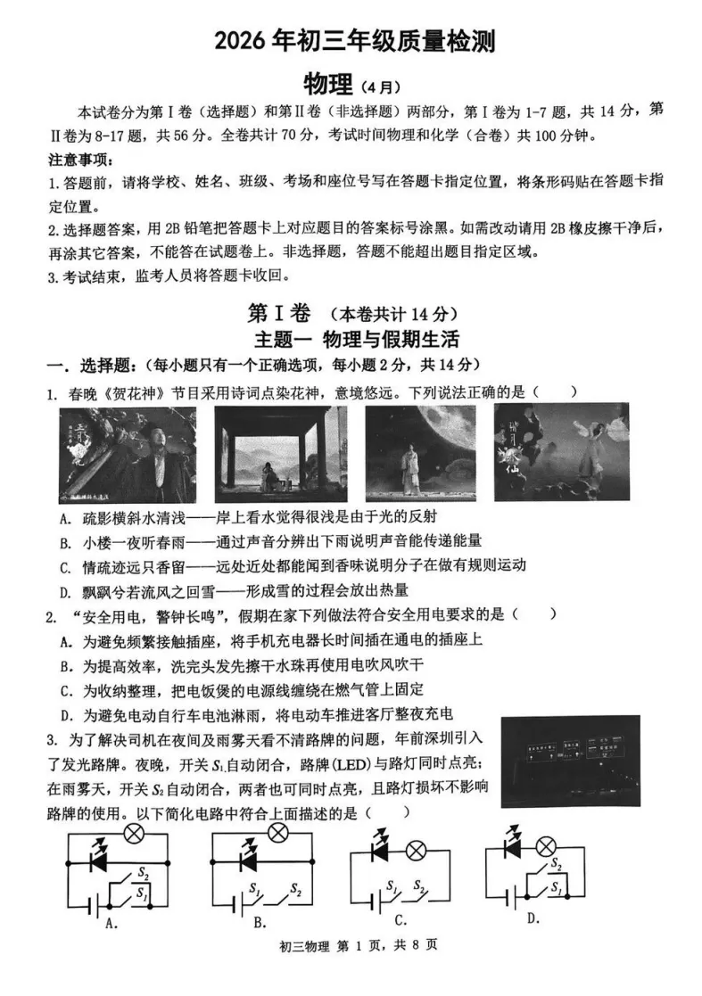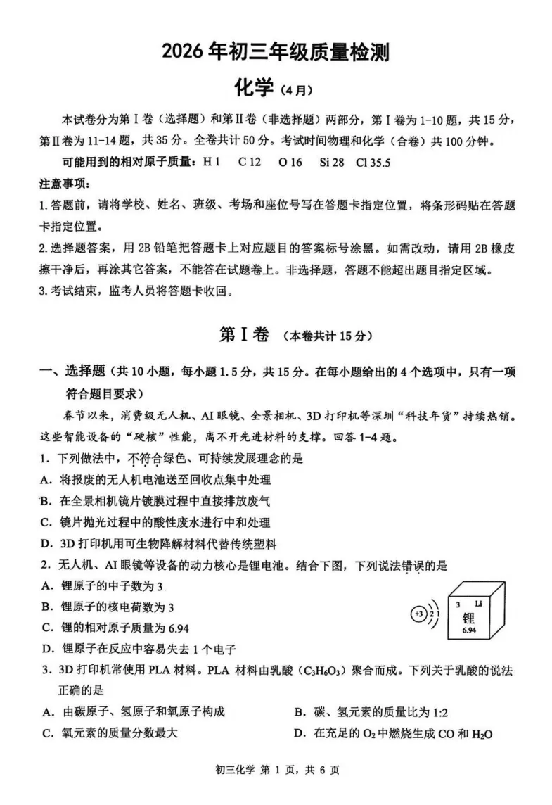 2026年4月深圳市34校联考初三二模全科真题及答案