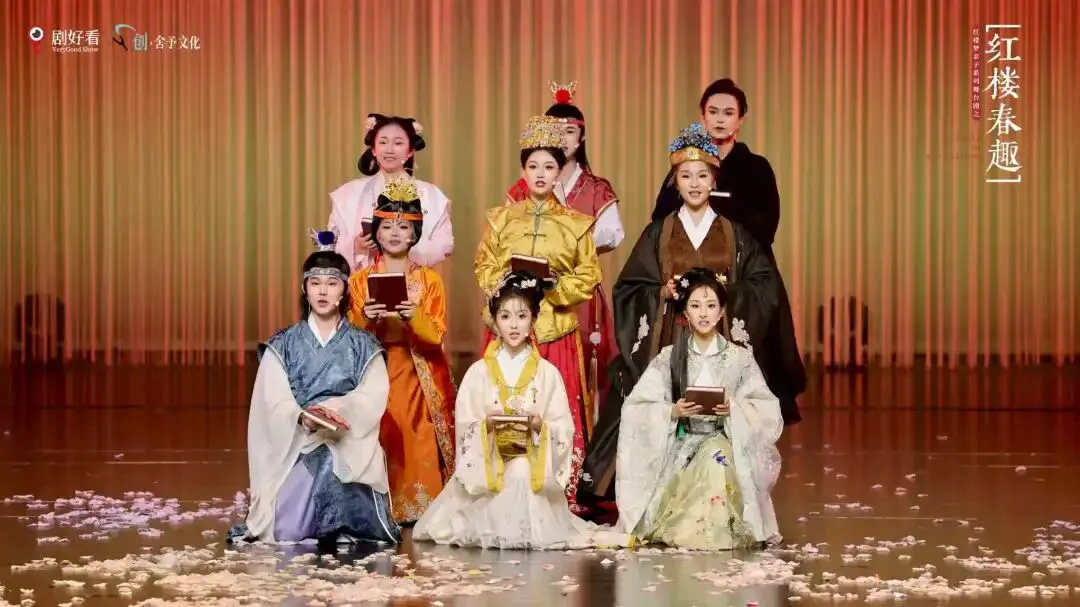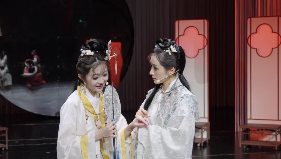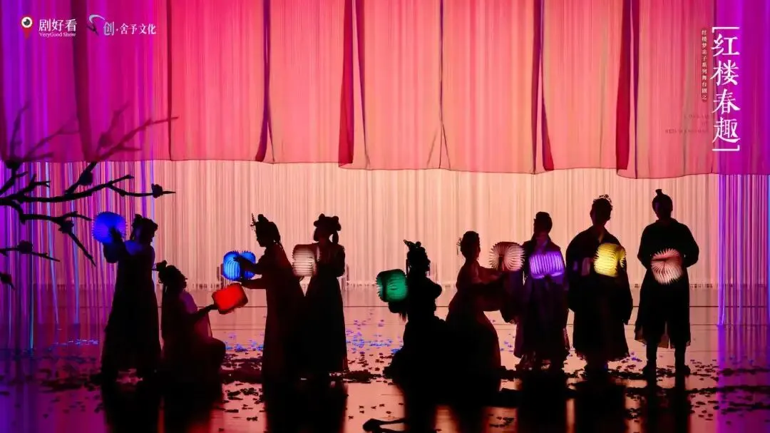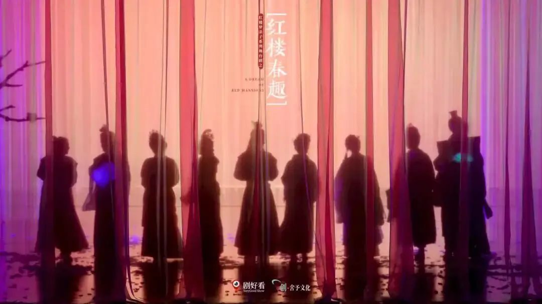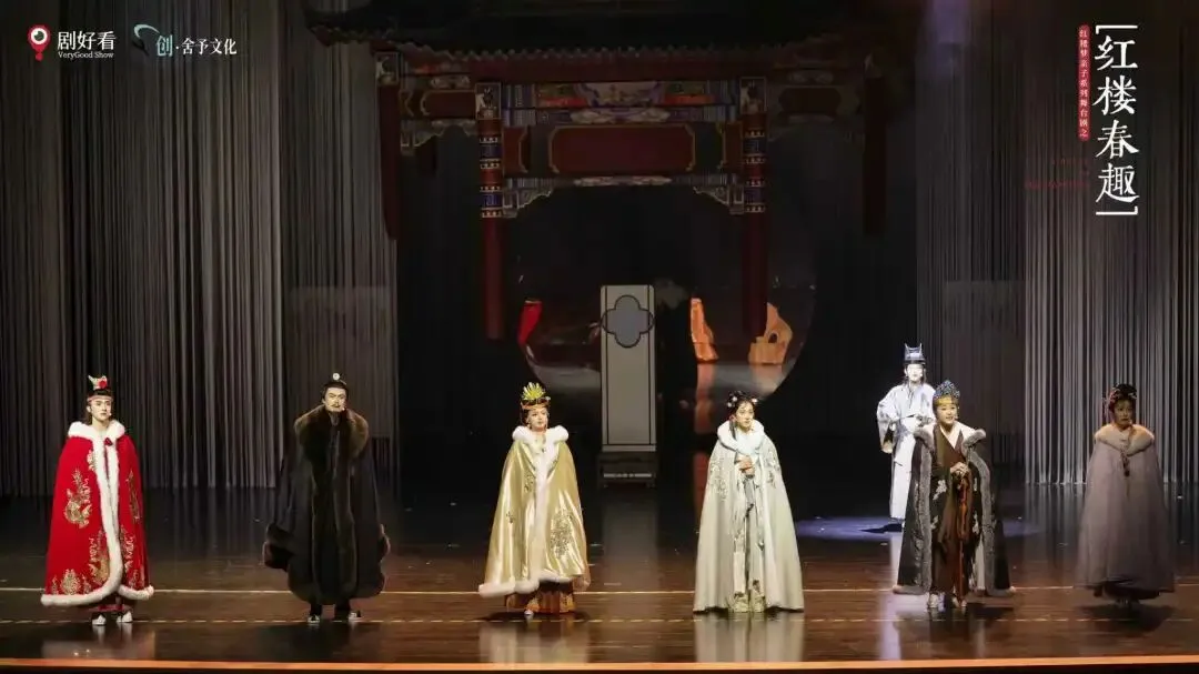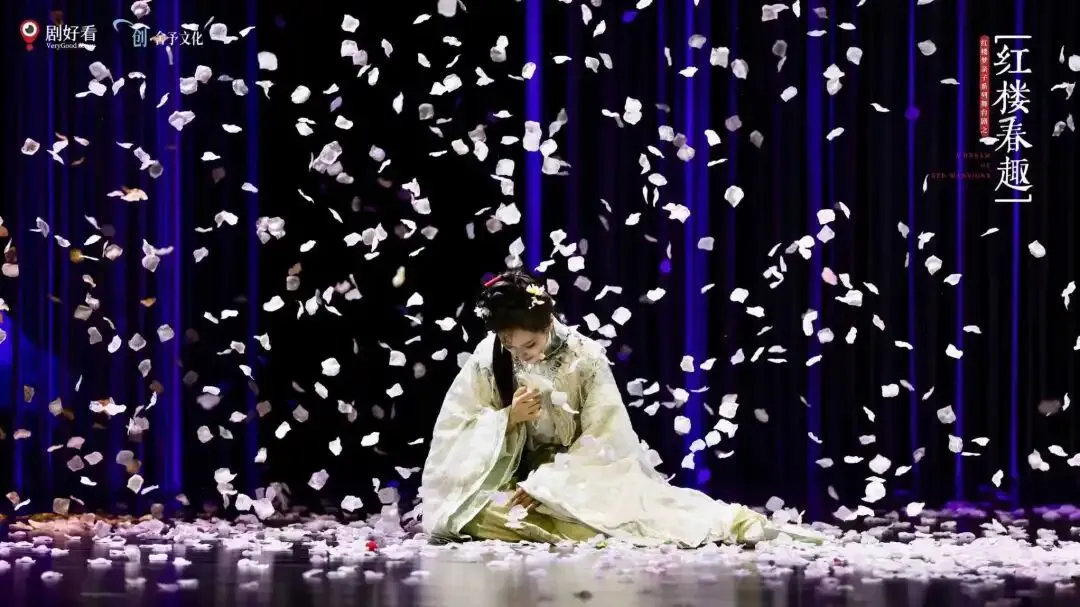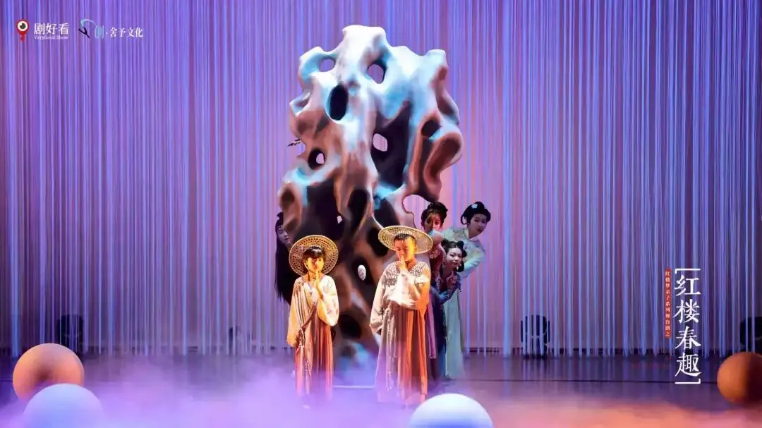 舞台上 1:1 复刻了大观园的亭台楼阁、春花烂漫,飞檐翘角、雕梁画栋,一抬头就是古色古香的中式意境。