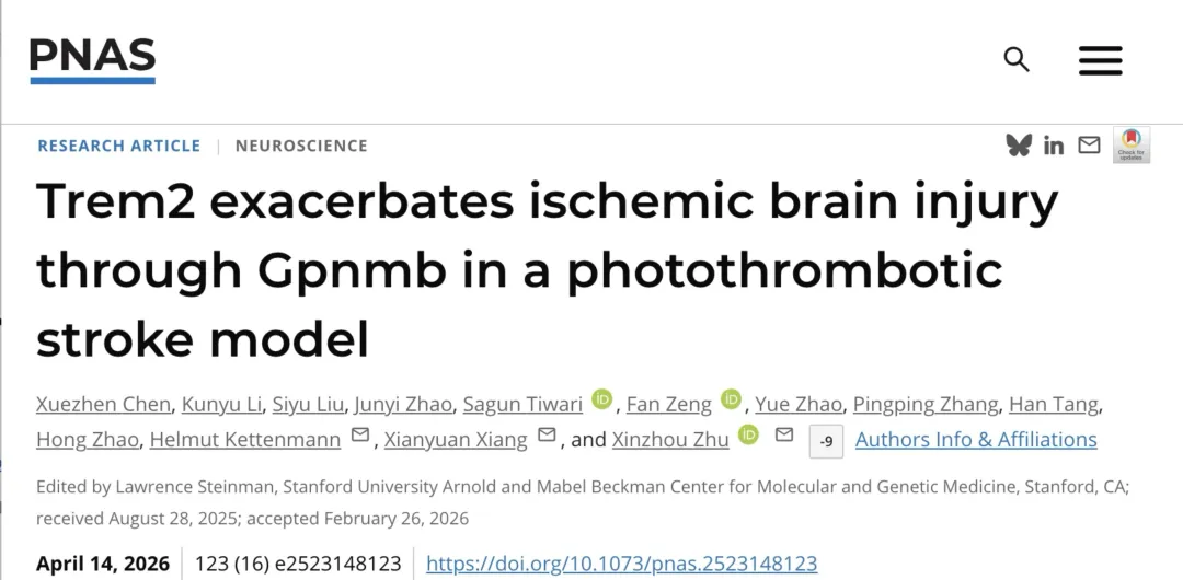 4月14日,中国科学院深圳先进技术研究院脑认知与脑疾病研究所/深港脑科学创新研究院祝心舟团队,联合深圳理工大学生命健康学院Helmut Kettenmann/项贤媛团队在国际期刊PNAS在线发表了一项题为“Trem2 exacerbates ischemic brain injury through Gpnmb in a photothrombotic stroke model”的研究论文。该研究揭示了Trem2在缺血性脑卒中后通过调控小胶质细胞介导神经炎症,进而加剧脑损伤的新机制,为理解卒中病理过程及临床转化提供了重要的新视角。