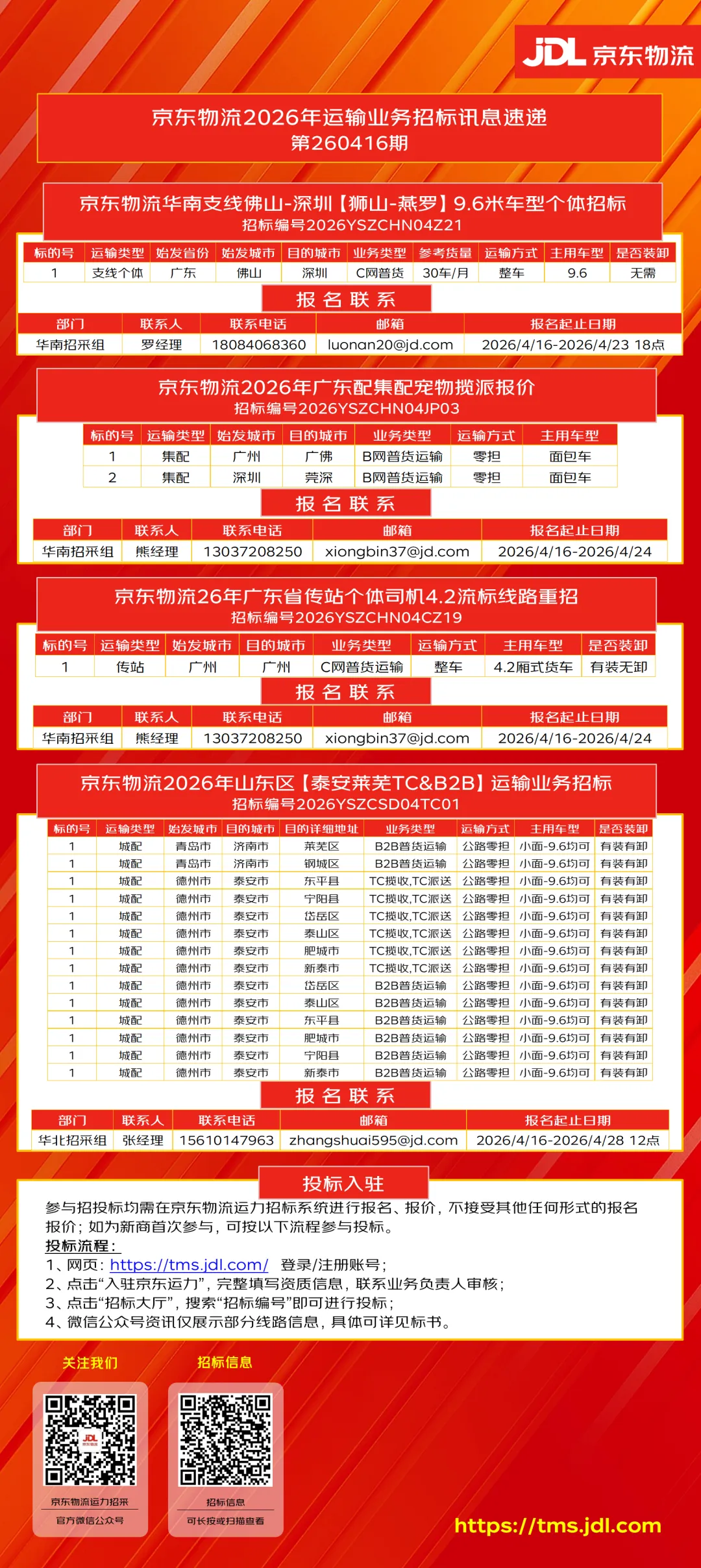 报名方式1、网页:https://tms.jdl.com/ 登录/注册账号;2、点击“入驻京东运力”,完整填写资质信息,联系业务负责人审核;3、点击“招标大厅”,搜索“招标编号”即可进行投标。本宣传资料为投标邀请,所示图片及文字仅供参考,不作为招标人向投标人发出之投标标的及入围承诺,不属于合同内容。本宣传资料制作时间详见发布日期。本公司保留对宣传资料修改的权利,敬请留意最新资料。本信息最终解释权归京东物流运力平台部所有。