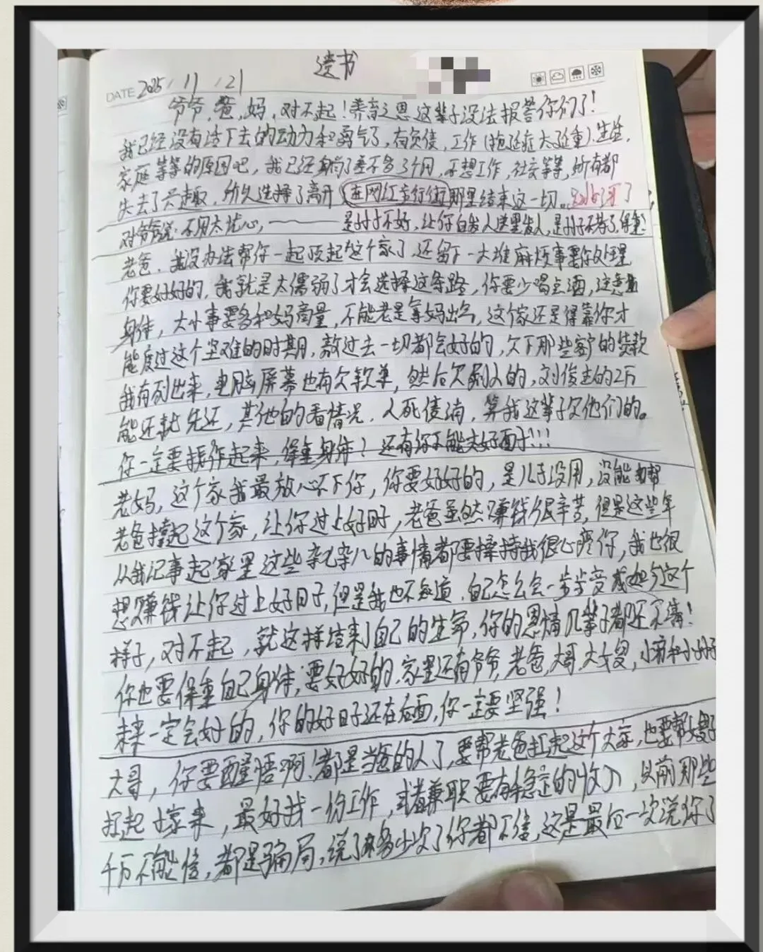 �� "爷爷奶奶,爸妈,对不起,养育之恩这辈子没法报答你们了!"