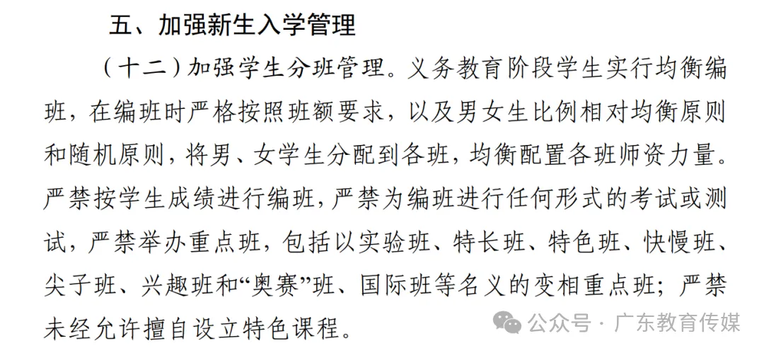 东莞还提出四个严禁:严禁按学生成绩进行编班;严禁为编班进行任何形式的考试或测试;严禁举办重点班,包括以实验班、特长班、特色班、快慢班、尖子班、兴趣班和“奥赛”班、国际班等名义的变相重点班;严禁未经允许擅自设立特色课程。