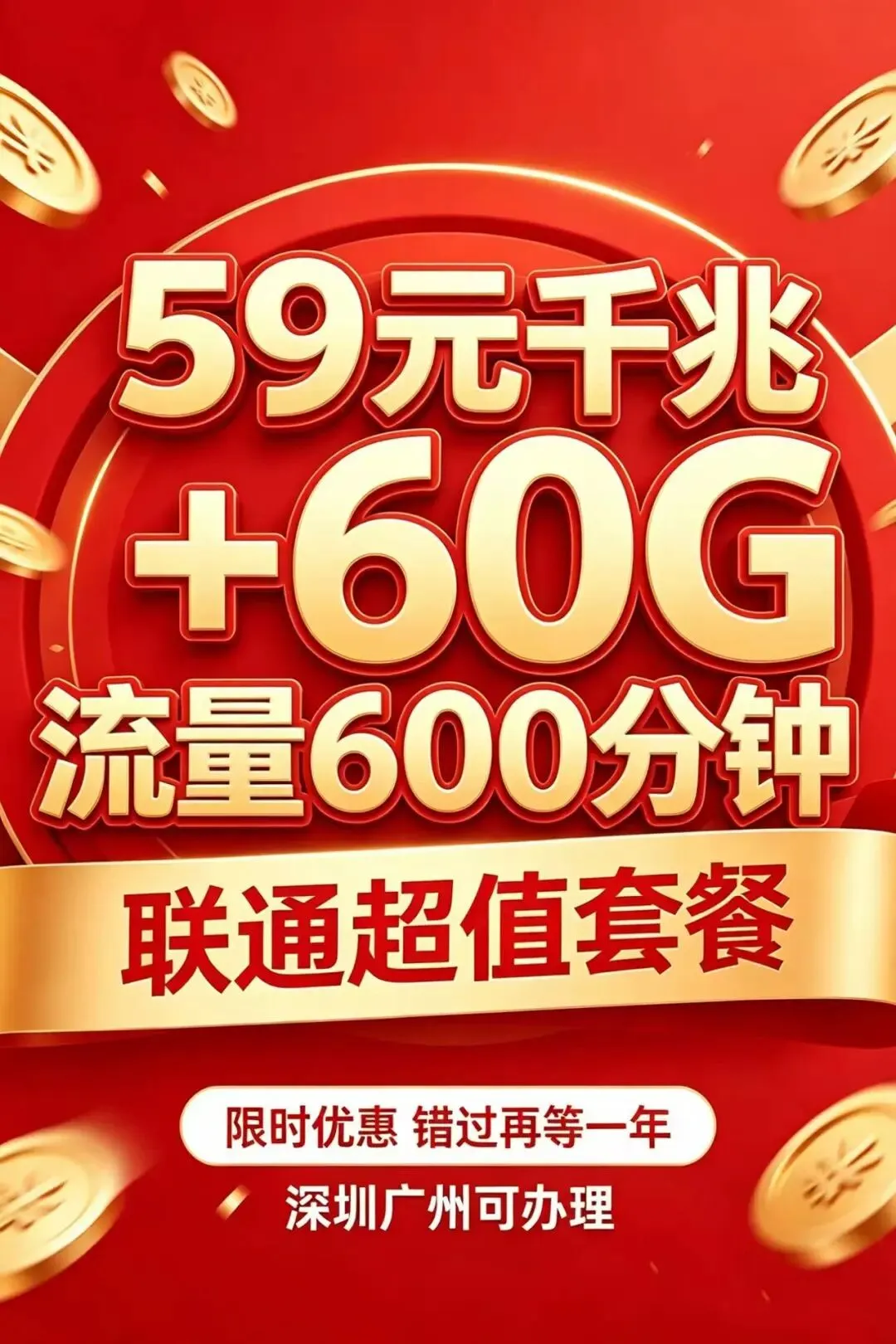 广州深圳专属套餐,59 元直接拉满配置!千兆宽带刷剧、打游戏告别卡顿,60G 流量通勤路上刷短视频、追剧完全不心疼,600 分钟通话满足日常工作摸鱼唠嗑!
