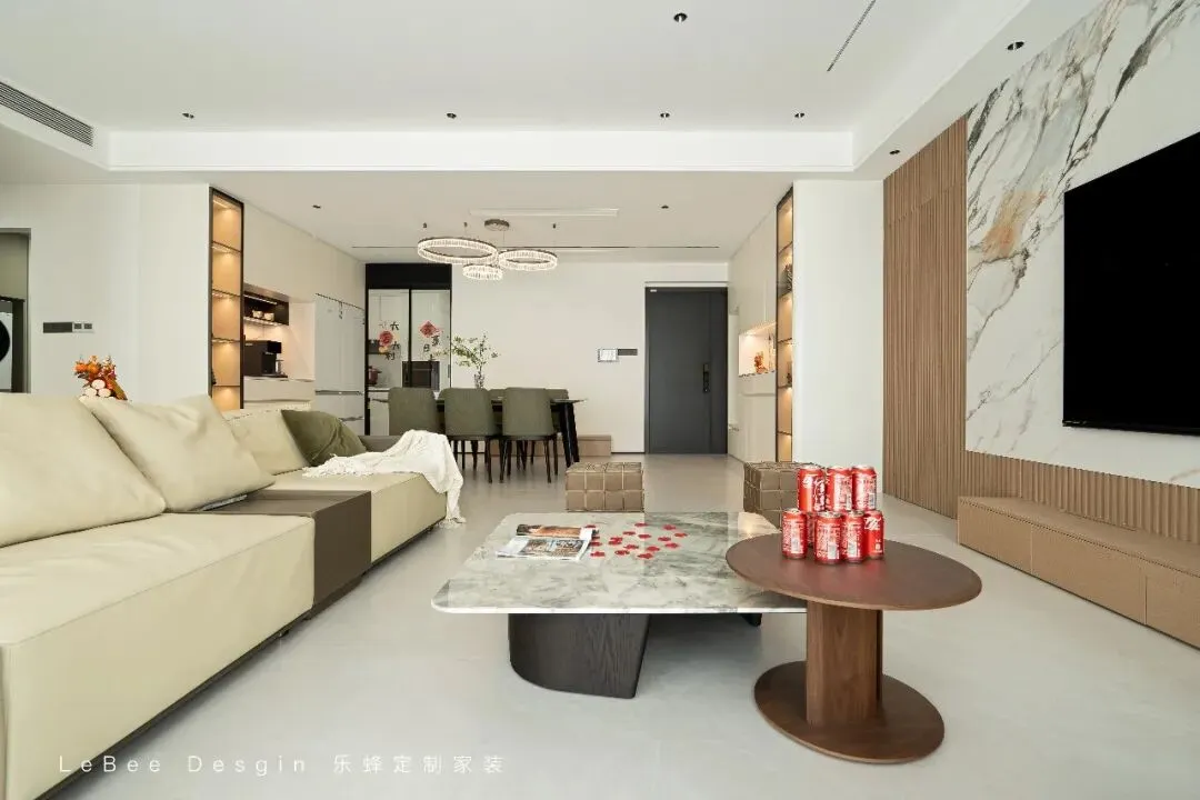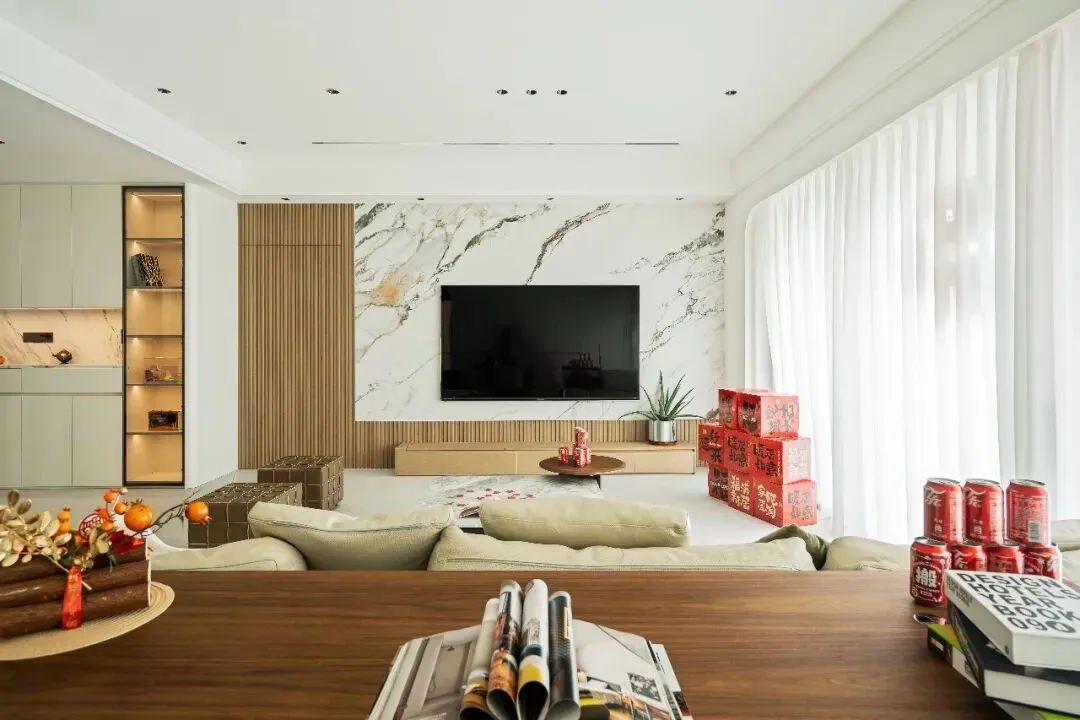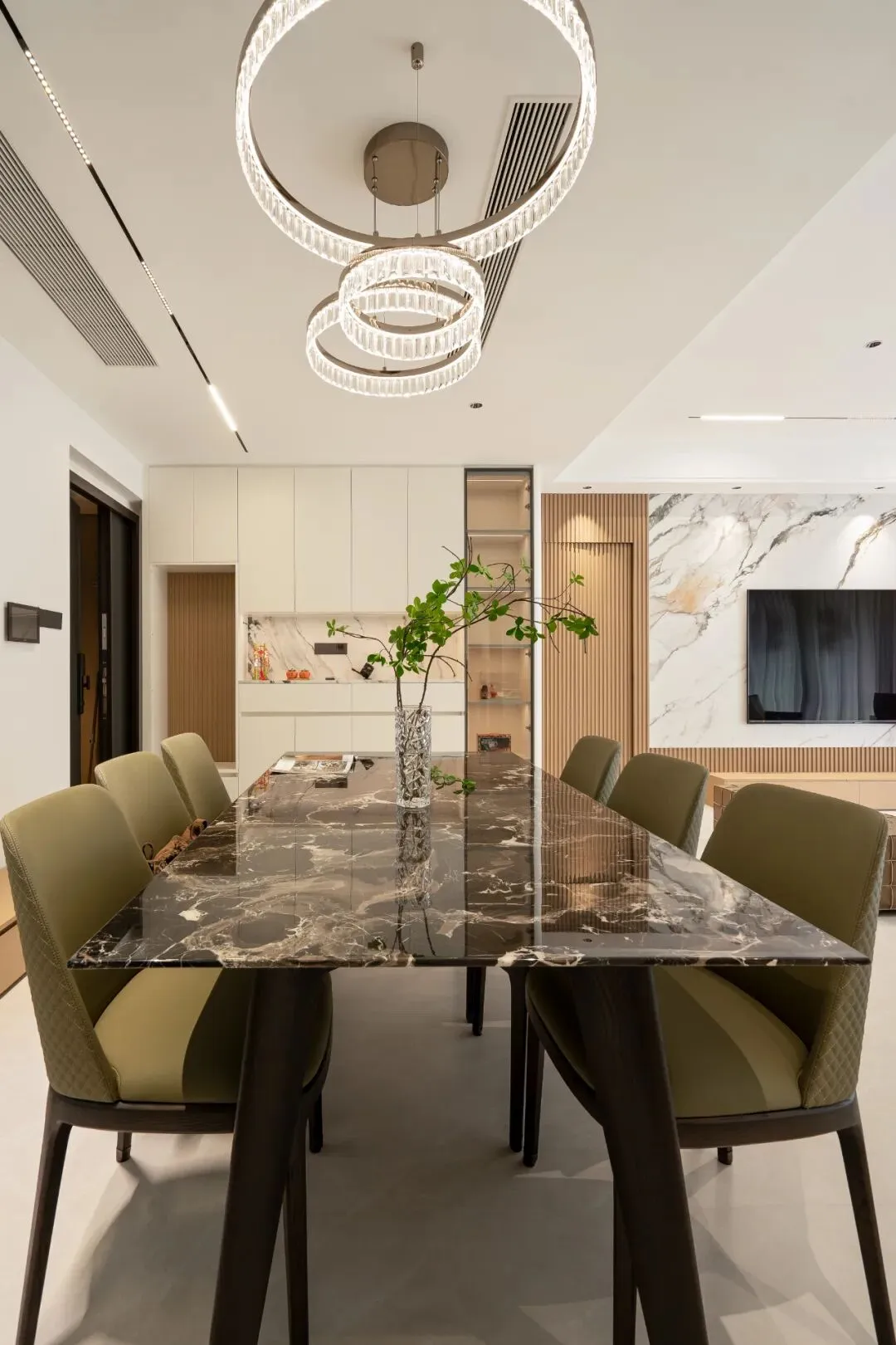 背景墙大理石与木格栅的冷暖对比,搭配米白、橄榄绿等低饱和度软装,营造出层次丰富又温润平衡的视觉体验。