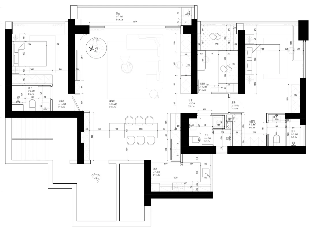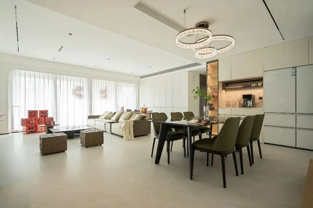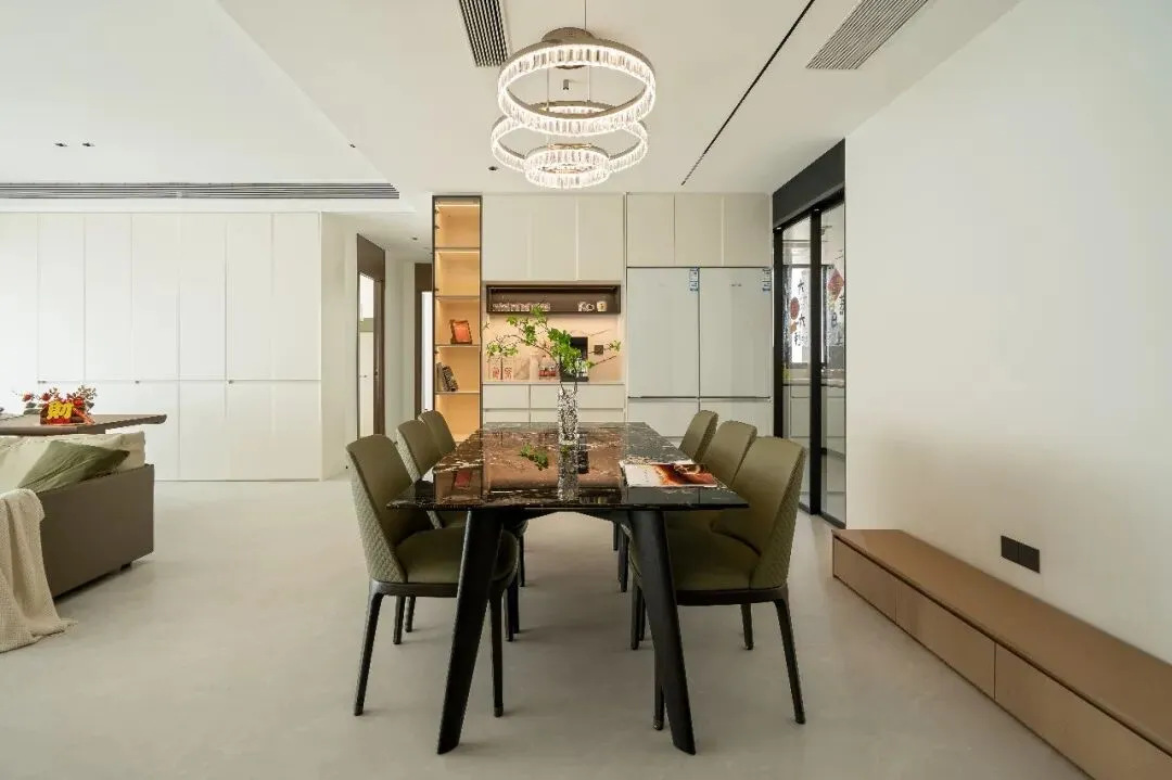 餐厅与客厅、厨房完全打通,没有实体墙隔断,形成了流畅的洄游动线。