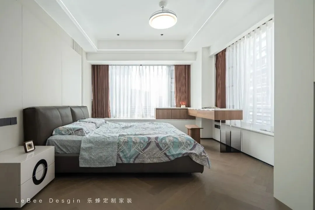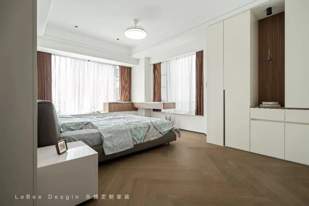 主卧套房改造,致力于打造一个功能完备的私享空间。卧室巧妙利用L型飘窗转角,定制悬浮式书桌,将死角转化为集办公、阅读与观景于一体的多功能区,并与整面墙的无把手衣柜、木格栅隐形门共同构建出简洁流畅的视觉平面。