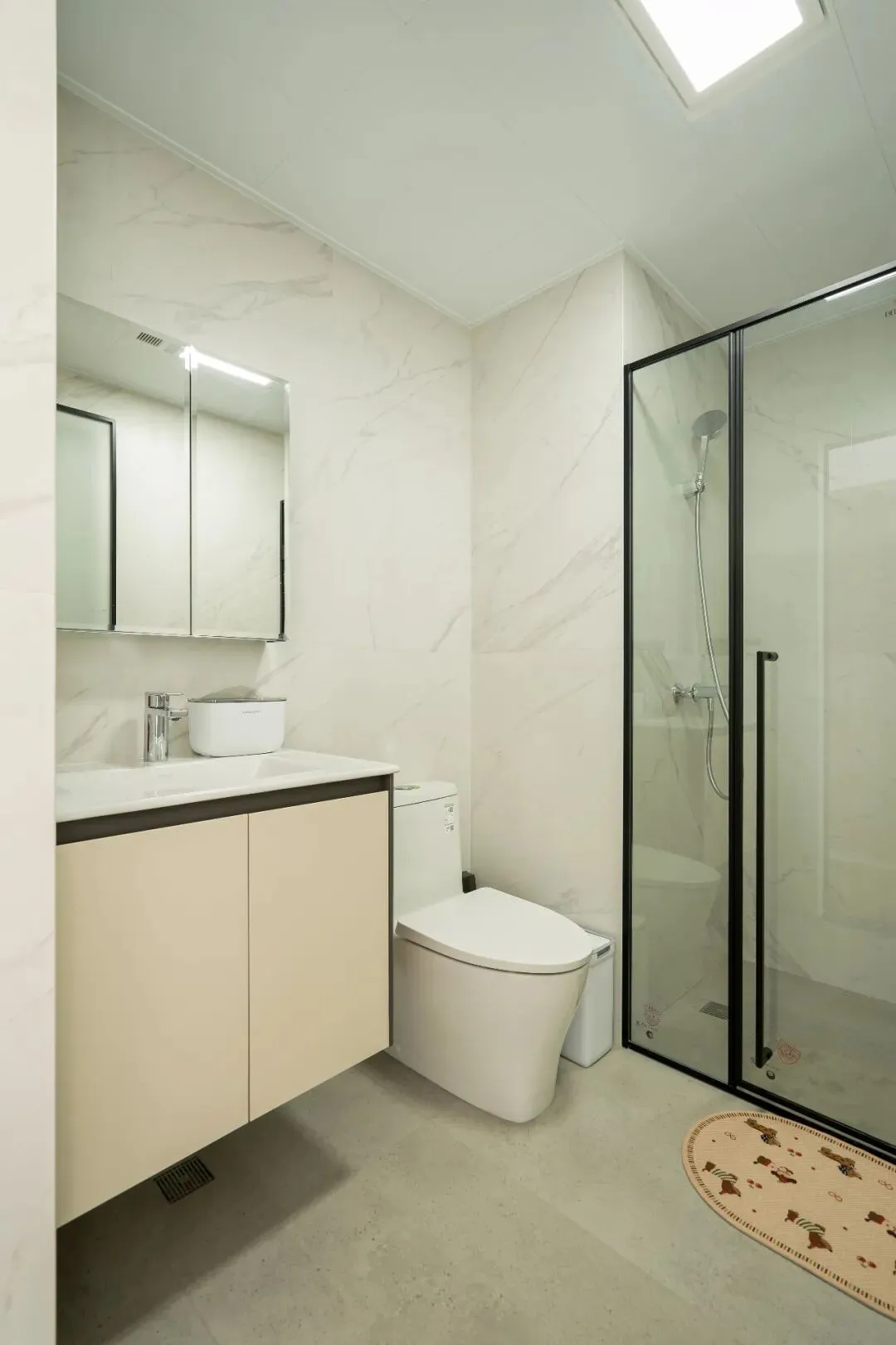 卫浴采用高效的三分离布局,以黑色五金勾勒出浅色石材空间的精致轮廓,并通过镜柜与悬空浴室柜保障实用收纳。