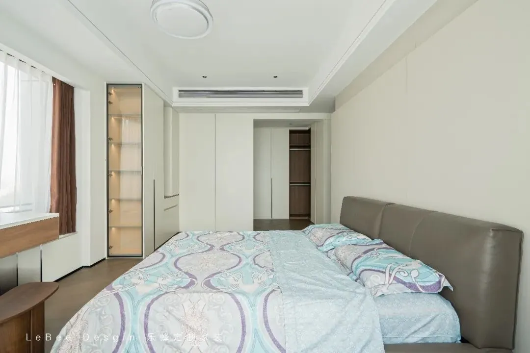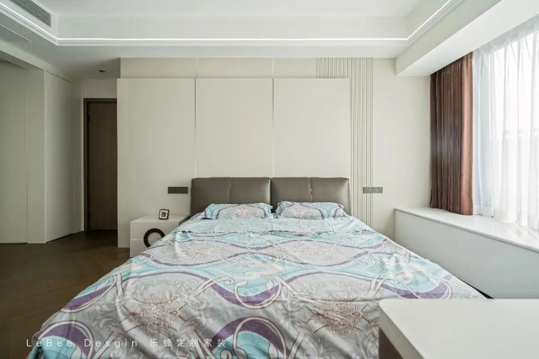 睡眠区选用护脊软包床头与柔和的米棕色调,结合均匀的无主灯照明,营造出舒缓身心的休憩氛围。