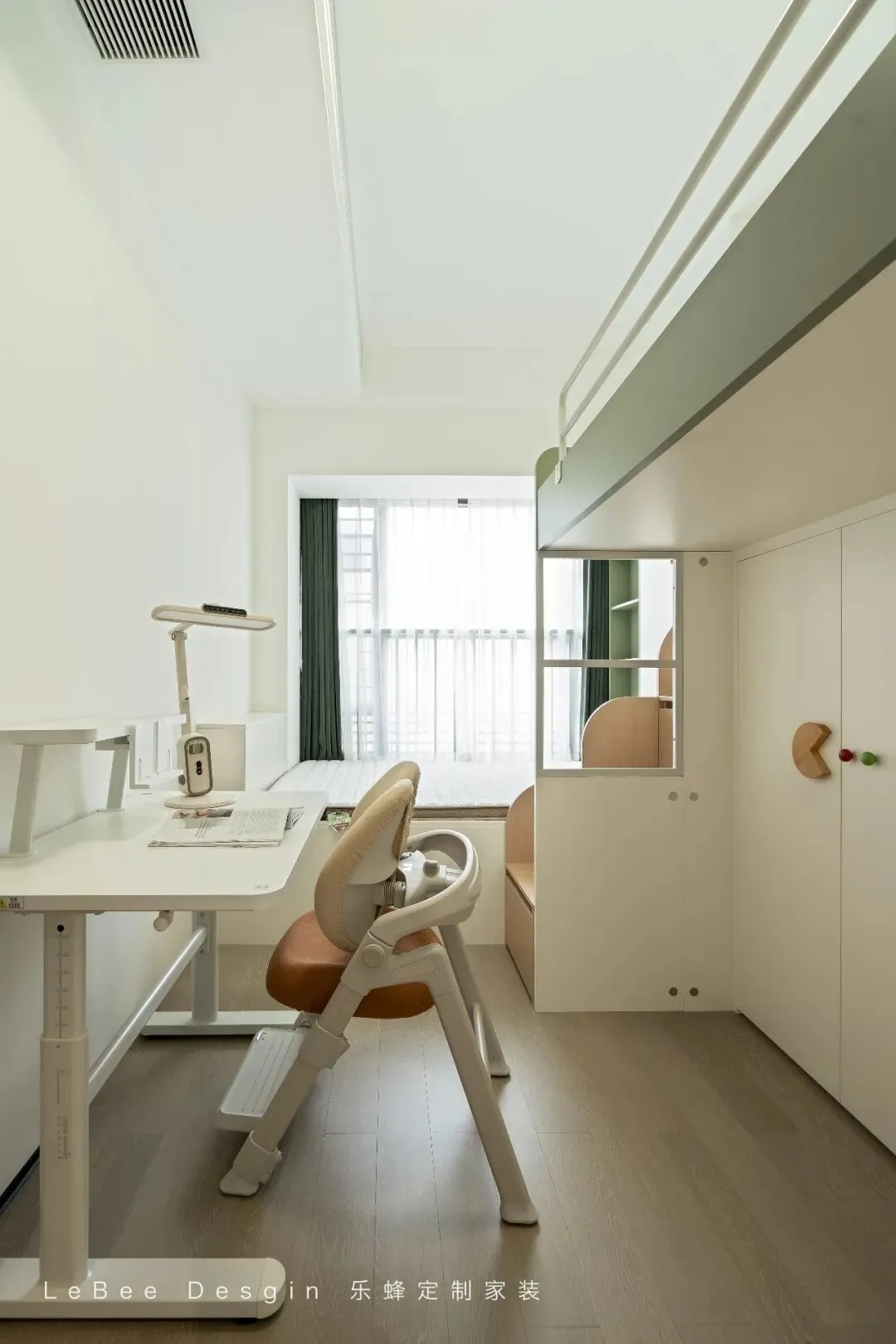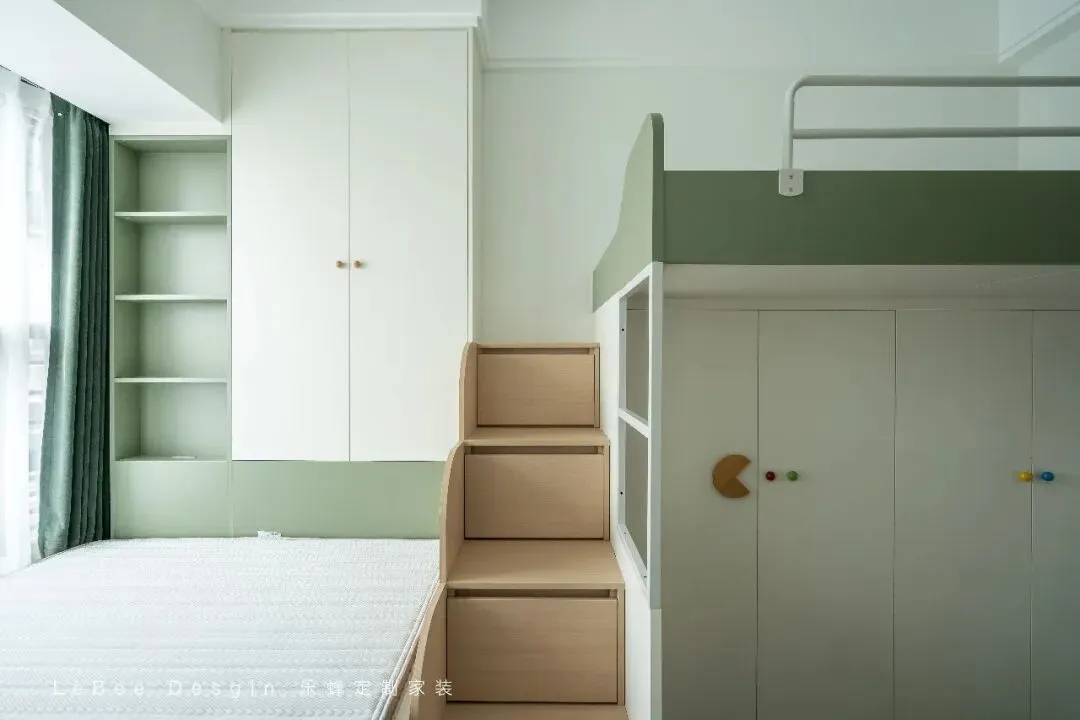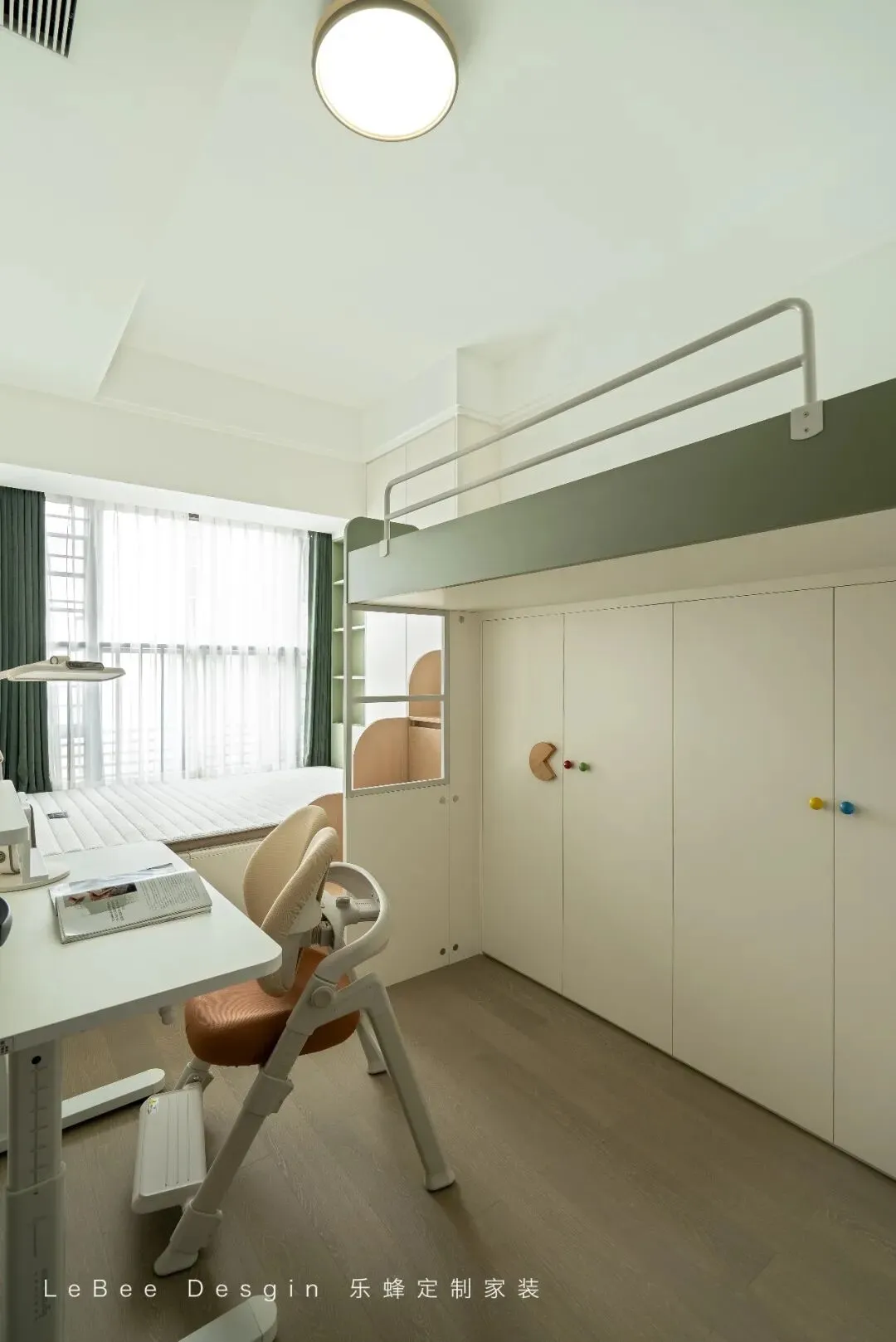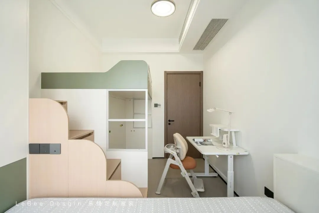 儿童房改造以“成长陪伴”,上层为睡眠区,下层释放出的空间与书桌、收纳区结合,同步满足睡眠、学习、游戏与储物需求。