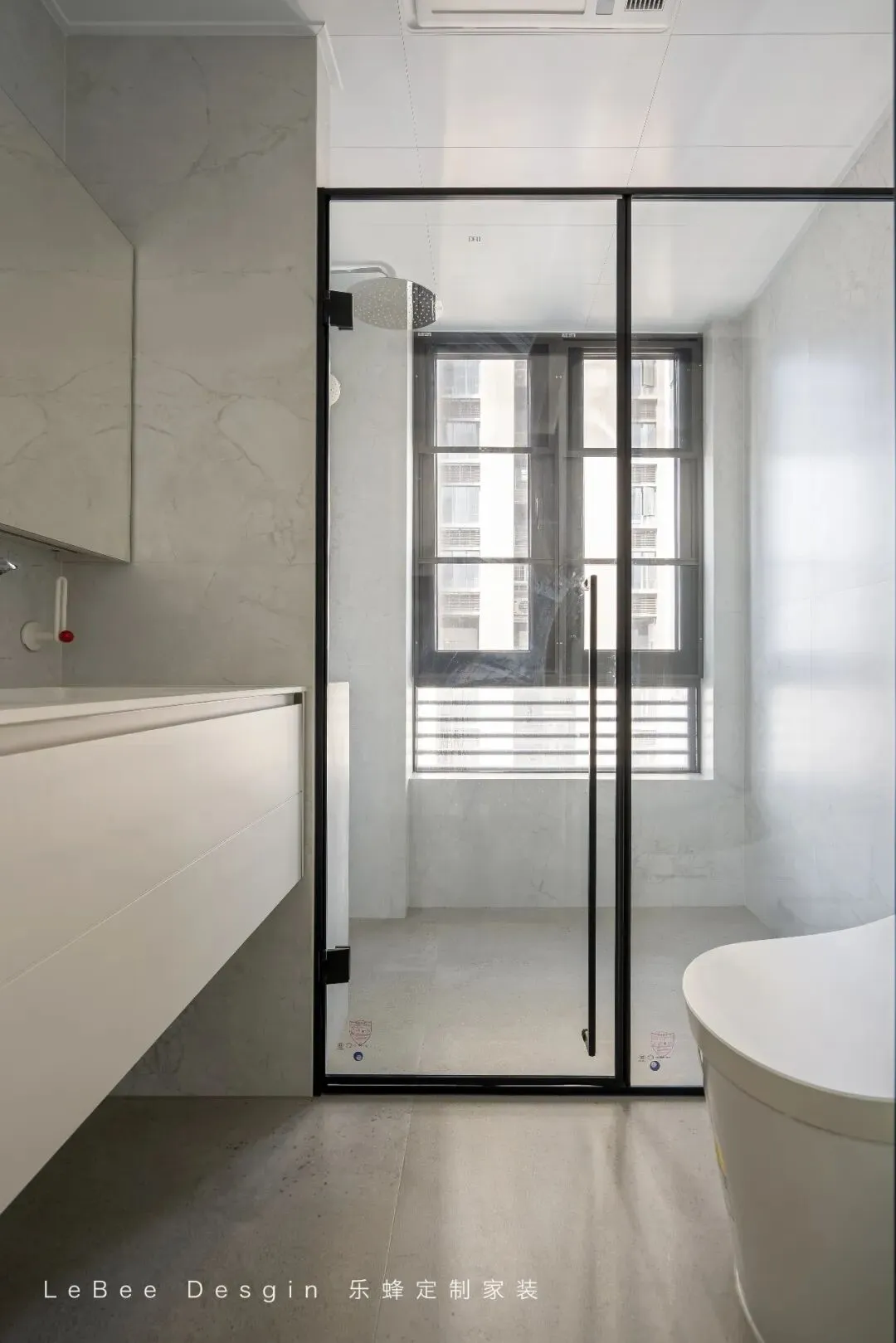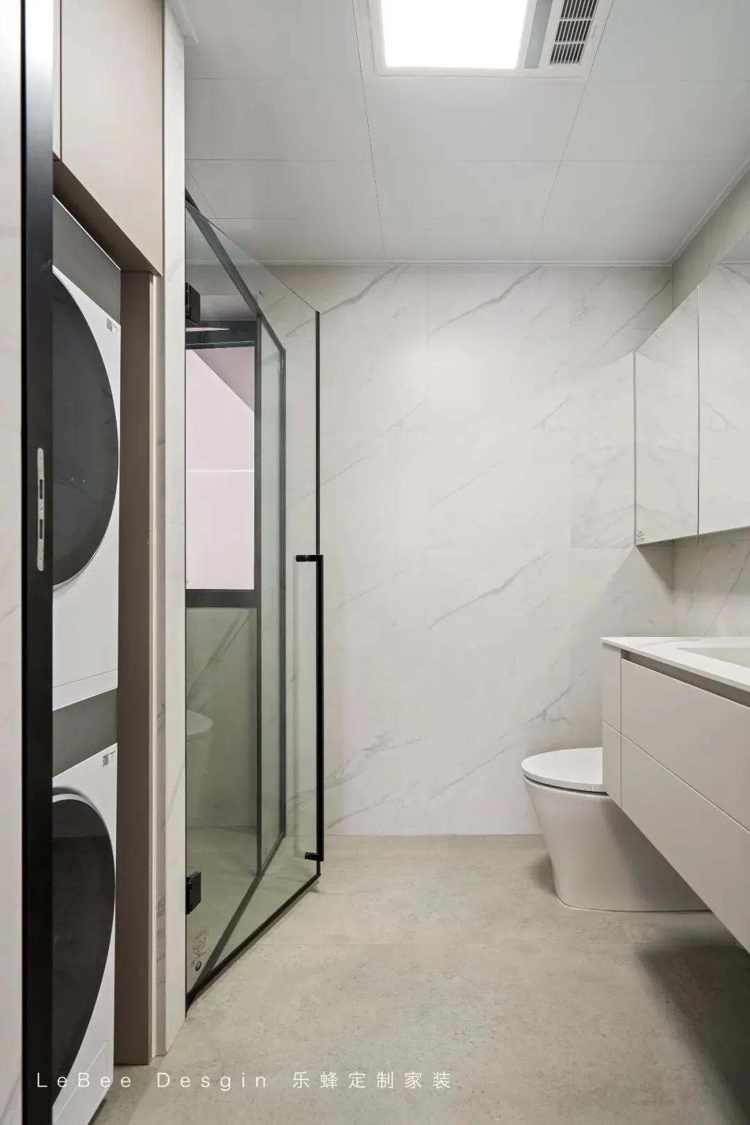 洗衣区通过洗烘一体机竖向嵌入墙体,节约空间并保持动线独立;淋浴区以黑色边框玻璃隔断实现视觉通透与有效干湿分离,结合大尺寸外窗确保通风采光,持久维持空间干爽。