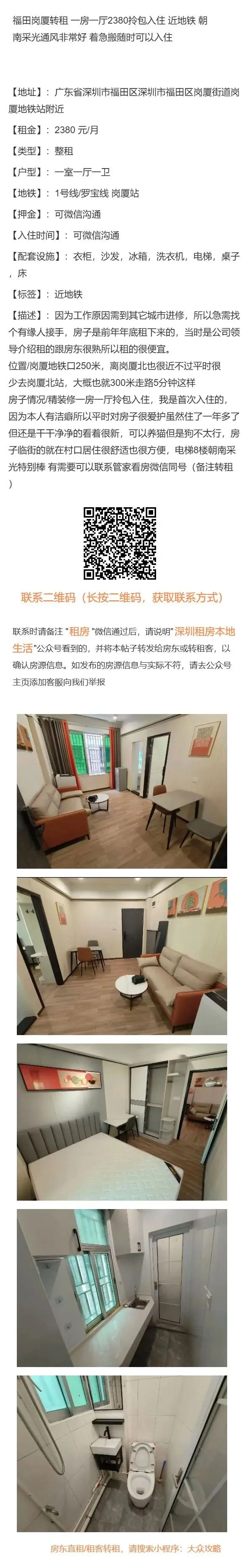 【深圳租房本地生活:免责申明】以上内容受用户委托发布,谢绝转载。房源信息的真实性、合法性由提供者负责,本公众号不声明或保证内容之正确性和可靠性,深圳租房需谨慎,请先核实出租人身份,仔细阅读租房合同,切勿轻易转账、交订金等,房屋出租过程中产生的一切问题,与本公众号无关。【深圳租房本地生活:特别申明】深圳租房本地生活没有任何线下业务人员,请勿轻信冒认我司线下工作人员及电话沟通人员,我司目前唯一对外沟通窗口为公众号主页客服微信:Hey_Beijinger