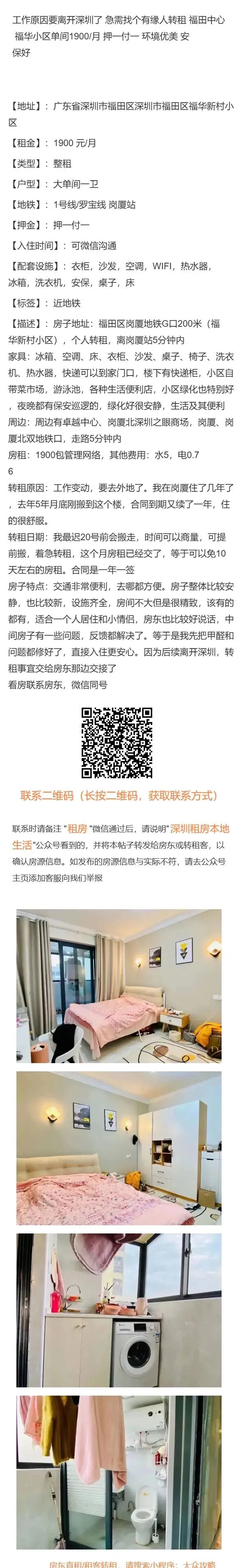 工作原因要离开深圳了 急需找个有缘人转租 福田中心 福华小区单间1900/月 押一付一 环境优美 安保好