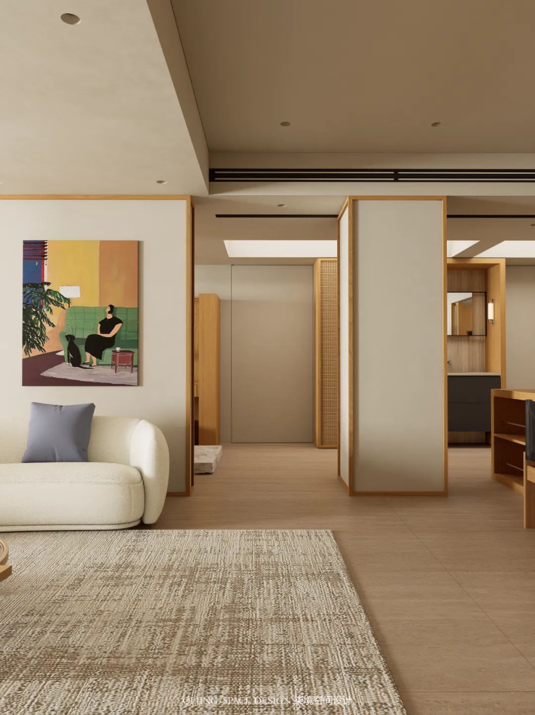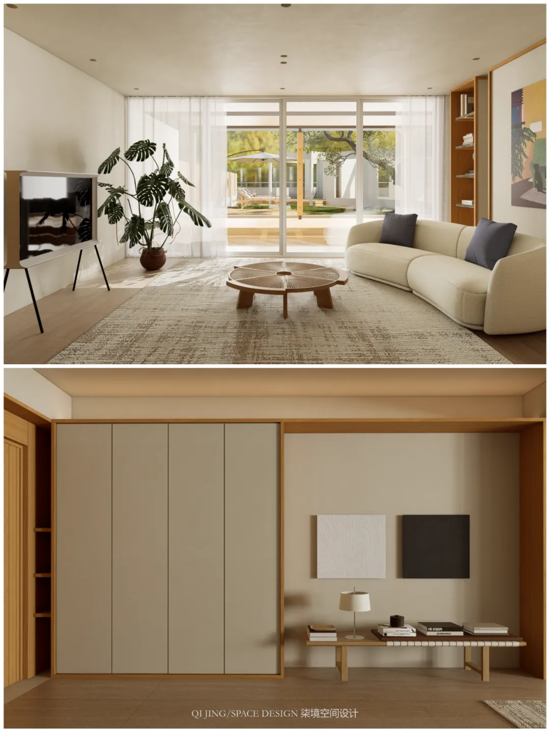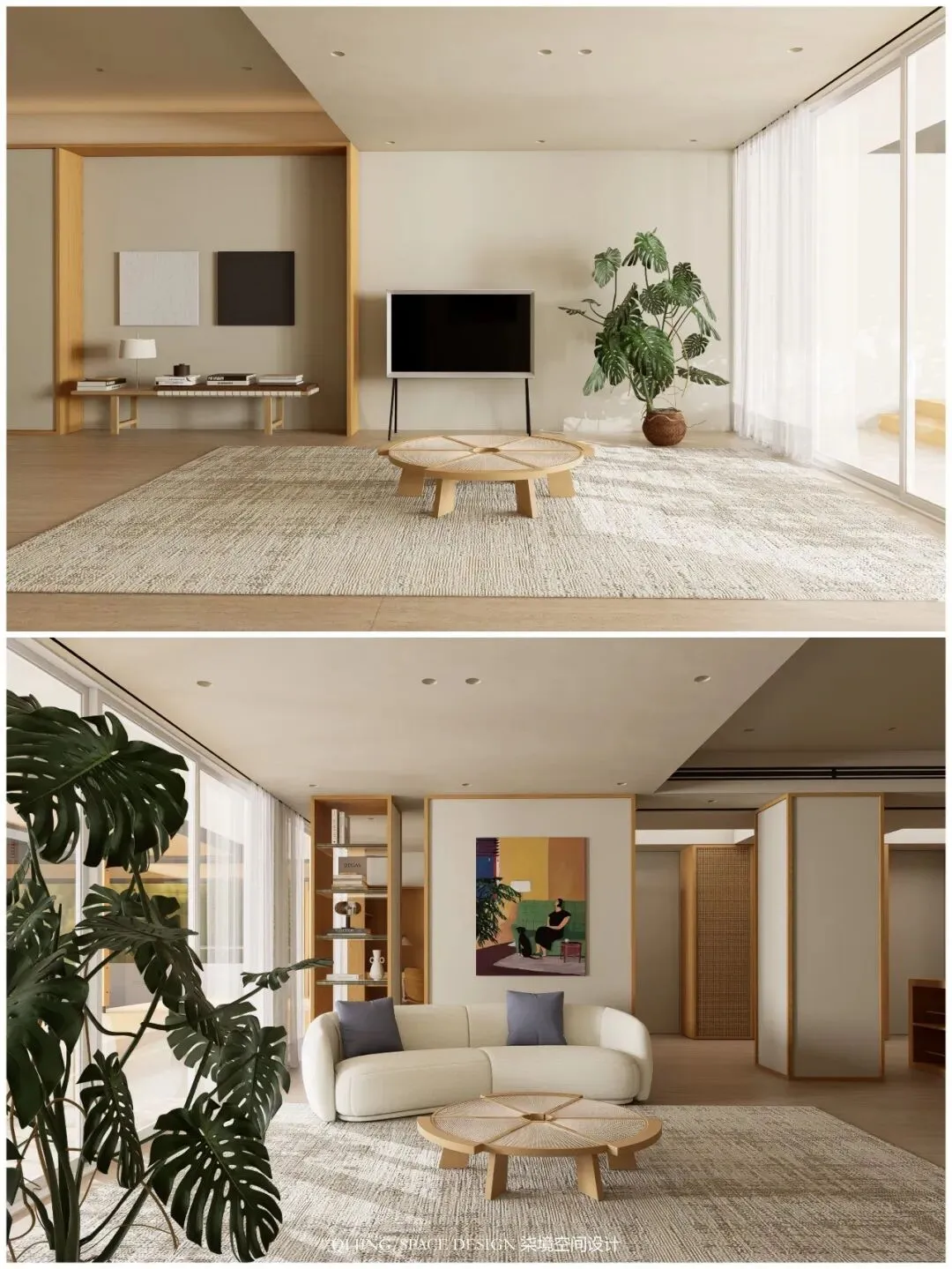 没有冗余的装饰,只有木质的温润、棉麻的柔软,与光影的低语