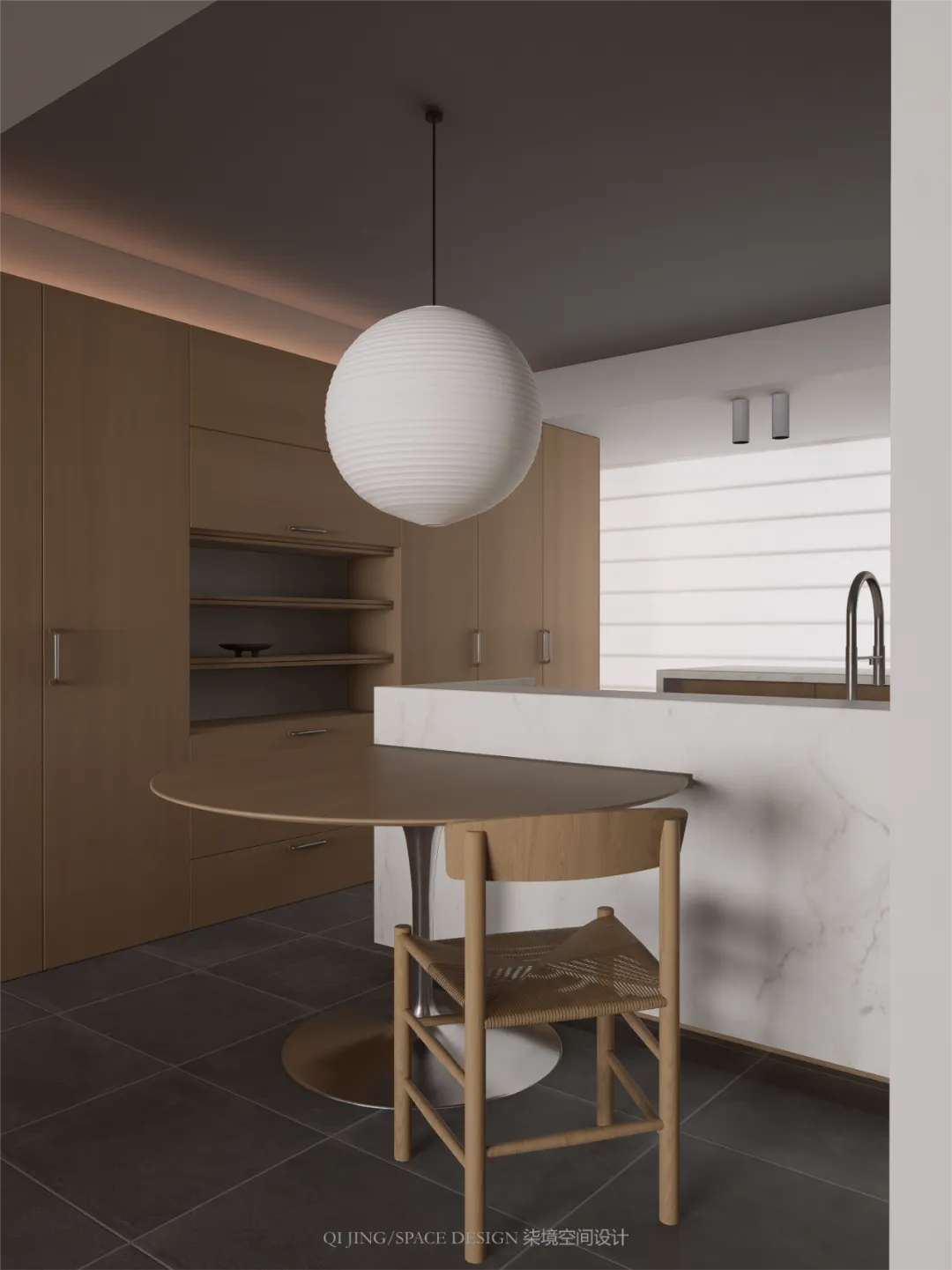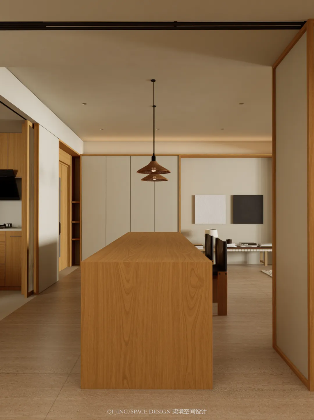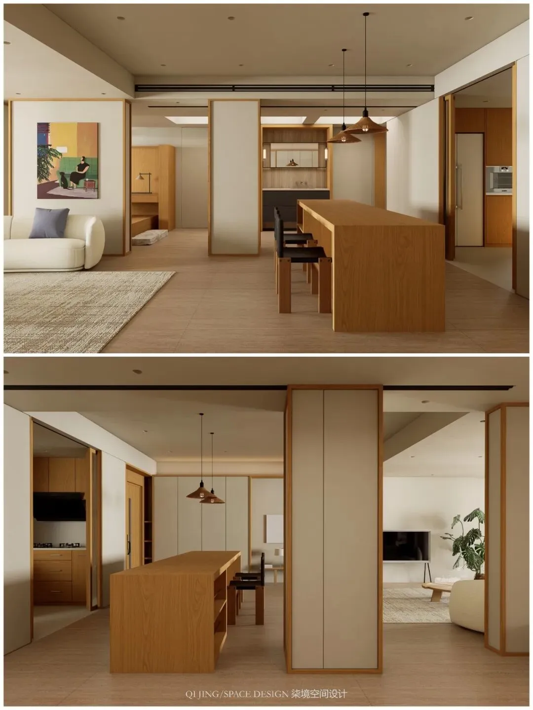 转身看向餐厅,长条形岛台延伸空间感,旁边的厨房区域,嵌入式家电让空间更整洁。客厅与餐厅的共生感