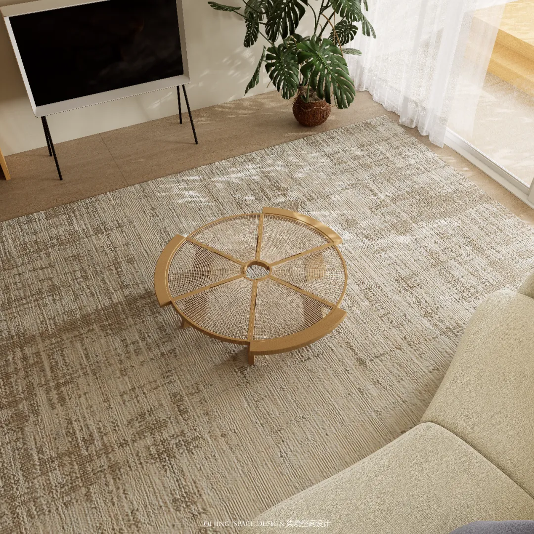 沙发是空间的温柔容器,坐在这里,仿佛被阳光和温暖“拥抱”。花瓣形茶几的编织纹理带着手作的温度,墙面艺术画点亮空间色彩,不远处的工作区藏得巧妙,木色书桌与客厅呼应