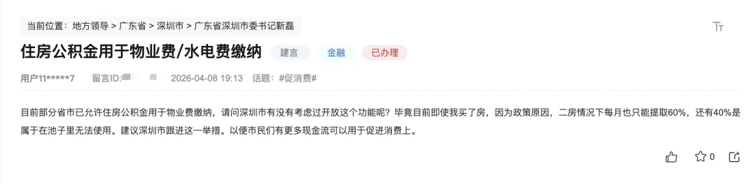 该市民反映,目前全国已有部分省市允许住房公积金用于物业费缴纳。为此,其建议深圳市跟进这一举措,考虑开放住房公积金用于缴纳物业费或水电费,以便市民有更多现金流可用于消费。
