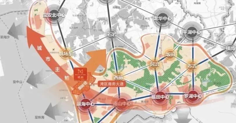 ✨【超配站位】深圳核心发展圈 黄金双轴交汇点✨城市发展主轴&湾区商务大道交汇构筑黄金十字轴,珺悦ROYAL PARK立足双轴轴心,擎动城市资源开关。• 东西横轴:深圳城市主轴自罗湖、福田、南山一路向西迭代,4.0城市新中心落定前海宝中。• 南北纵轴:2022年湾区商务大道规划设计公告发步,打造“对话世界、国际一流、湾区标杆”的纵向主脉。(规划来源:深圳市政府官网)