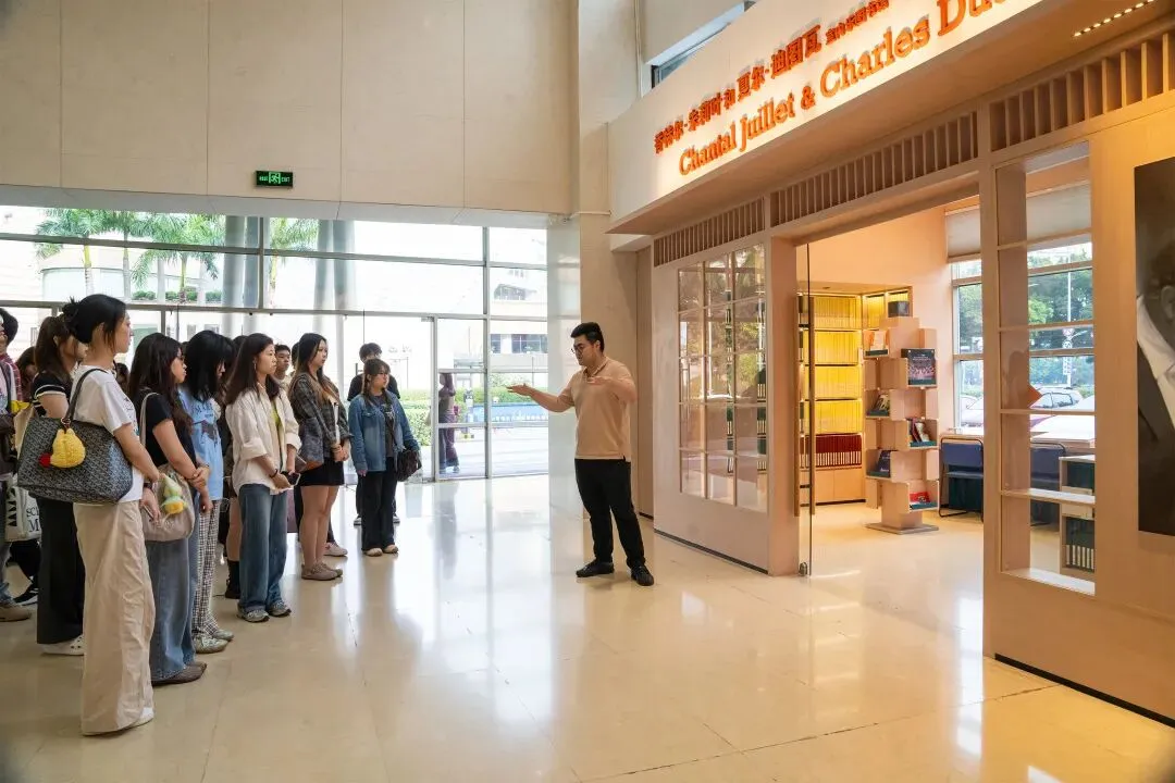 随后,同学们随指引前往星海音乐厅旁的广州交响乐团大楼。迎接大家的除唐主任外,还有乐团业务部杨主任,二位均为我院2025-2026学年校外行业导师。在两位主任的陪同下,同学们依次参观了室内乐图书馆、演员休息室、综合排练厅、录音室、专业琴房及乐团档案馆。
