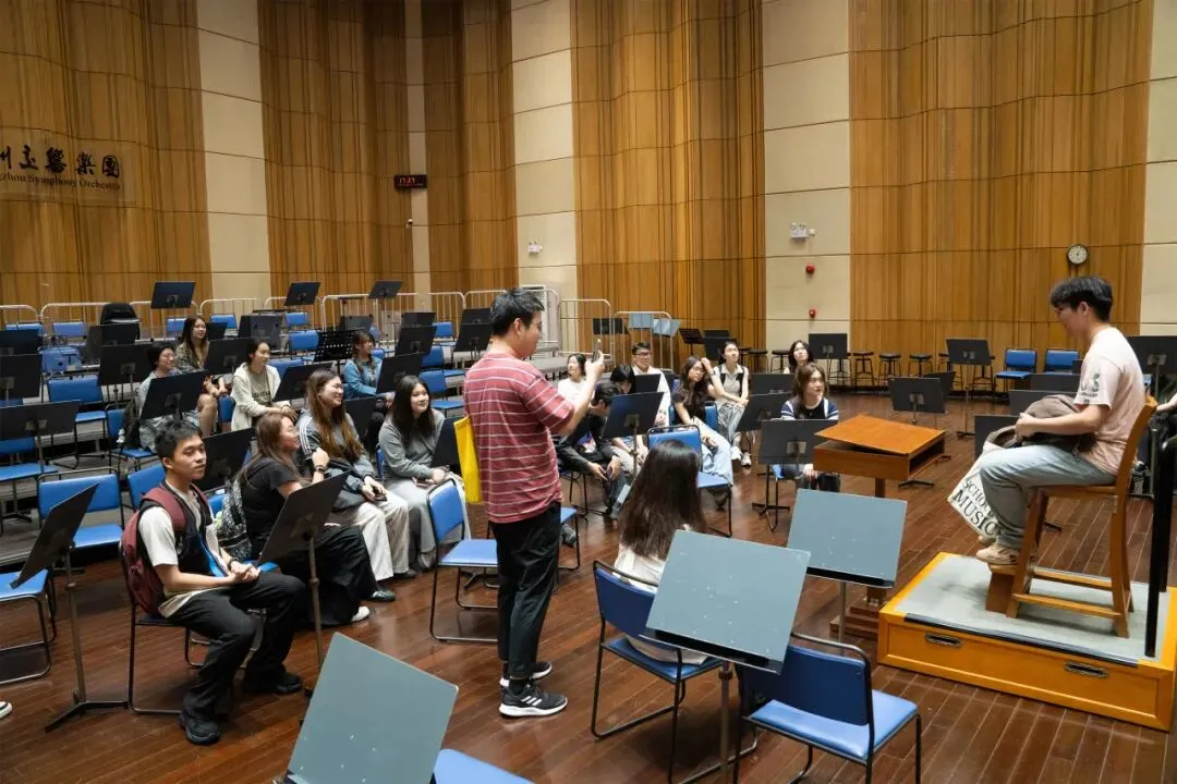 活动当日下午恰逢广州交响乐团举行“走进交响乐·相约音乐厅”普及音乐会彩排,乐团外联部唐主任带领同学们前往走台现场观摩。此前一晚,广州交响乐团刚完成深圳保利剧院演出,于凌晨方才返程休整,而音乐家们仍以饱满状态投入紧凑的彩排工作,其专业素养与对艺术的热忱令同学们深受触动。