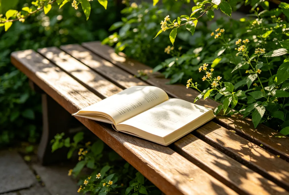 午后的阳光,透过枝叶的缝隙,洒在林间长椅上,暖意融融。身旁绿植葱郁,细碎小花缀在枝头,风一吹,淡淡花香萦绕鼻尖。