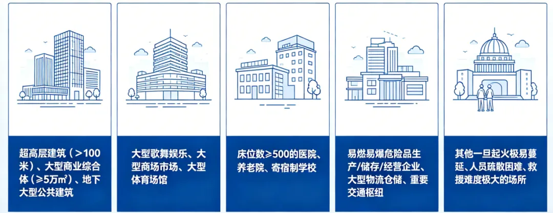 • 超高层建筑(>100 米)、大型商业综合体(≥5 万㎡)、地下大型公共建筑