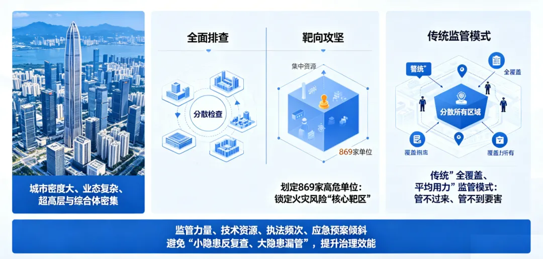 深圳城市密度大、业态复杂、超高层与综合体密集,传统 “全覆盖、平均用力” 的监管模式,既管不过来,也管不到要害。