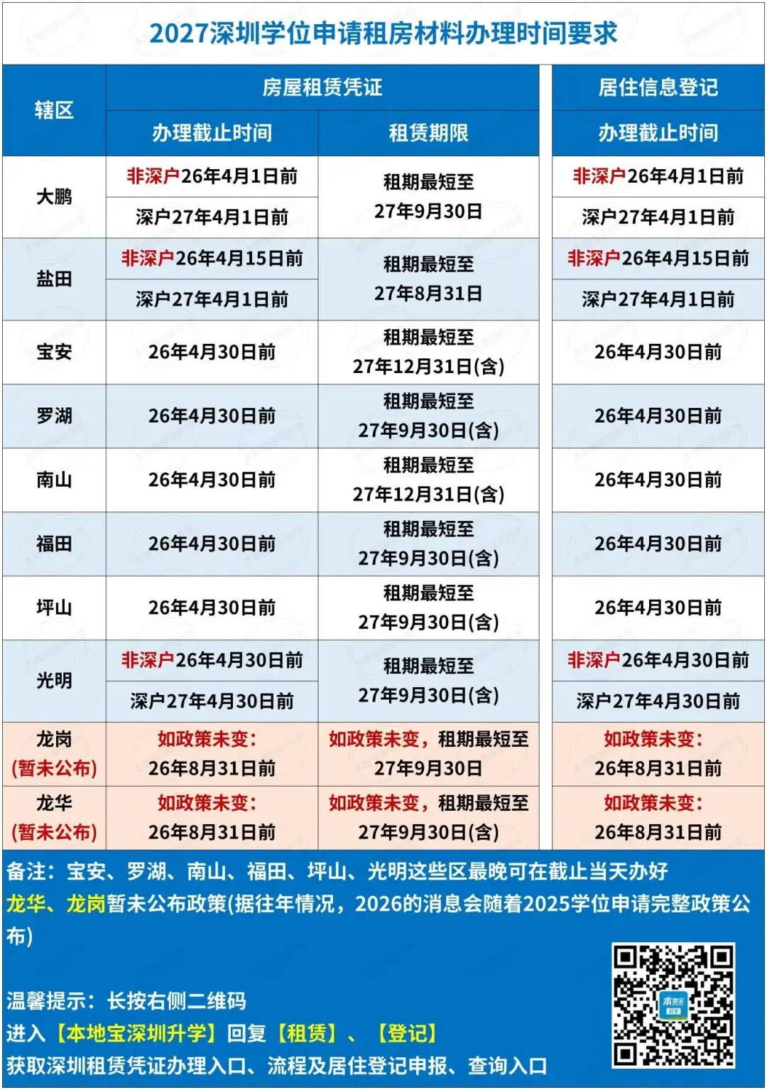 在往年,龙华龙岗的租赁凭证/居住登记办理截止时间是最晚的,都是学位申请前一年的8月31日前办理好就行