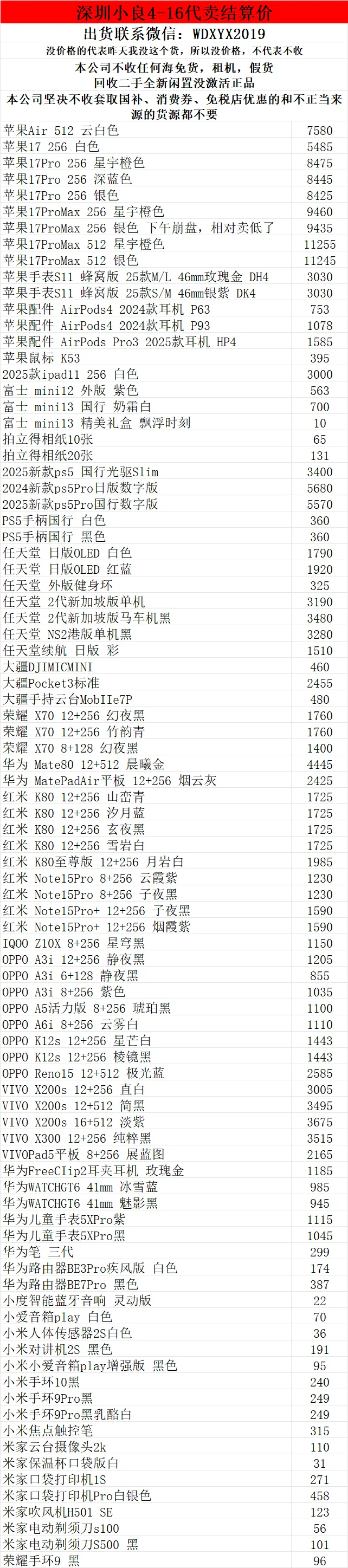 深圳小良2026.4.16电子产品代卖结算价(美妆价格小程序查看)