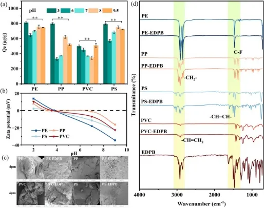 图2. EDPB在微塑料(MPs)上的吸附行为表征。(a) pH对吸附效率的影响;(b) 微塑料的ζ电位测定;(c) 微塑料及其吸附EDPB后的扫描电子显微镜(SEM)图像;(d) 红外光谱(FTIR)显示EDPB在微塑料上的吸附情况(PX-EDPB表示吸附的污染物)。误差线表示均值±标准差,**p < 0.01 表示组间差异具有统计学显著性。