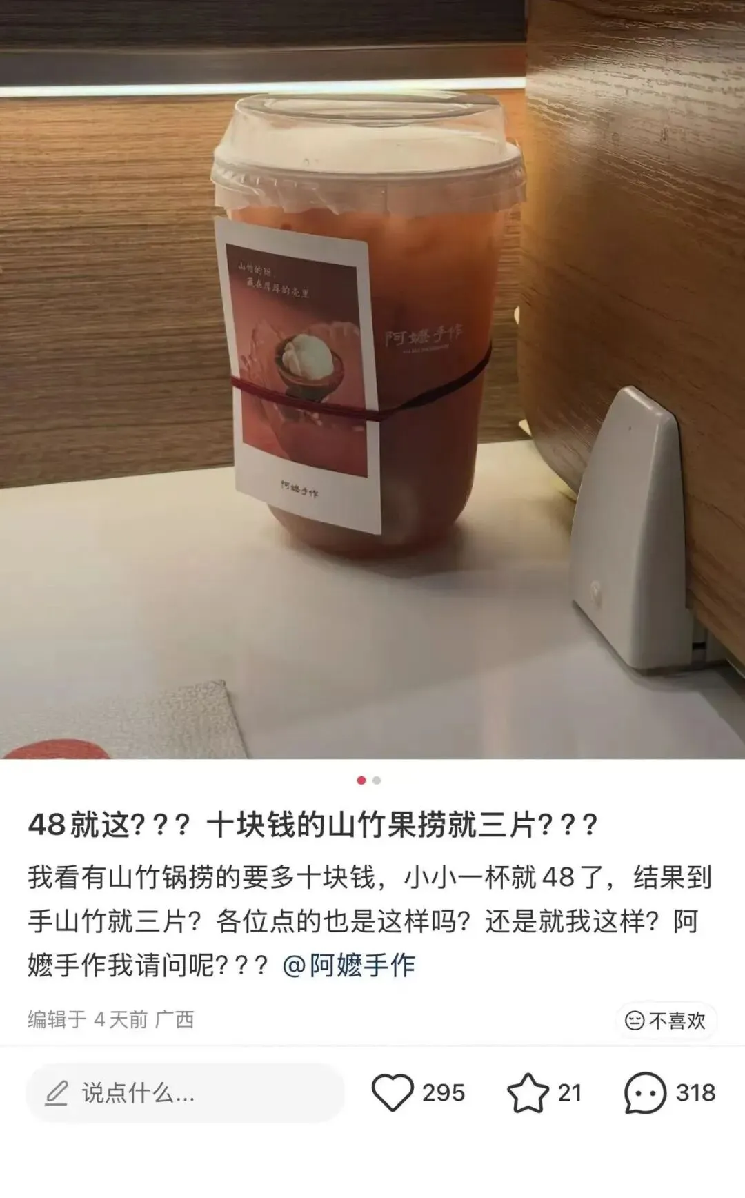 近日,网红新茶饮品牌阿嬷手作推出“莲雾与山竹”新品,因定价48元被消费者吐槽价格太贵。