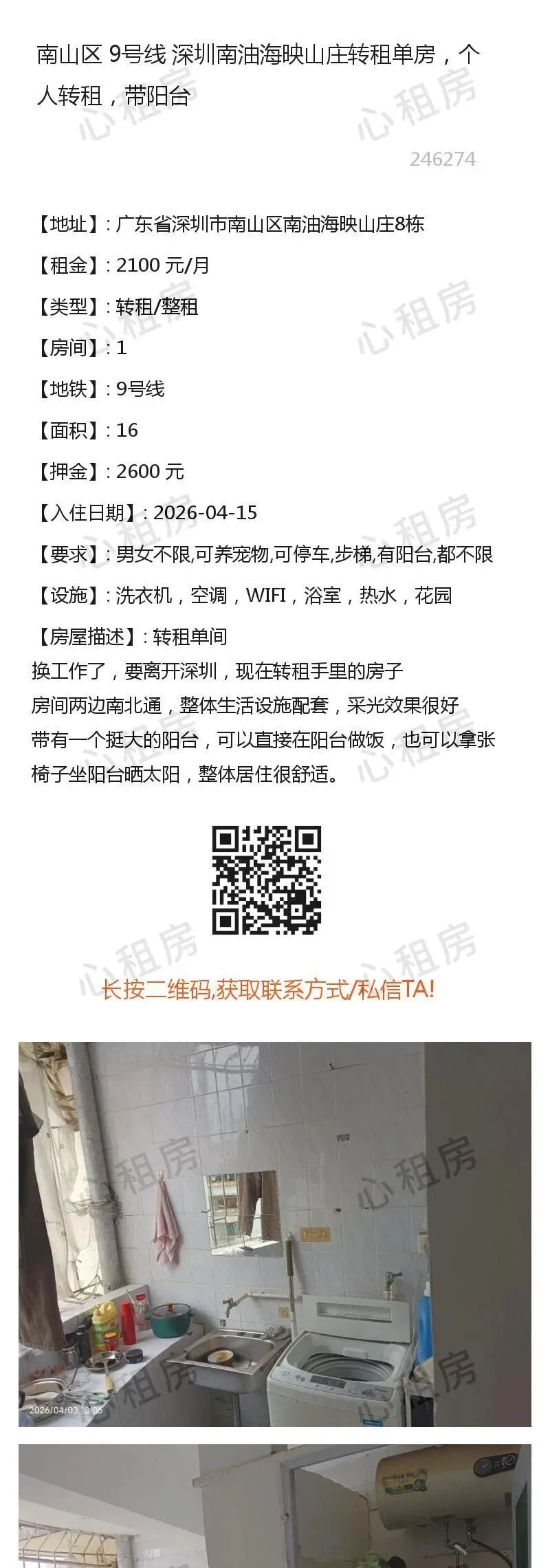 深圳租房>>南山区9号线深圳南油海映山庄转租单房,个人转租,带阳台2100元/月深圳租房>>南山区1号线步行3分钟到1号线深圳大新地铁口整租单房2080元/月深圳租房>>南山区5号线南山塘朗合租房找室友|5号线塘朗站|崇文花园独卫房间转租|5.10起租|2700元/月