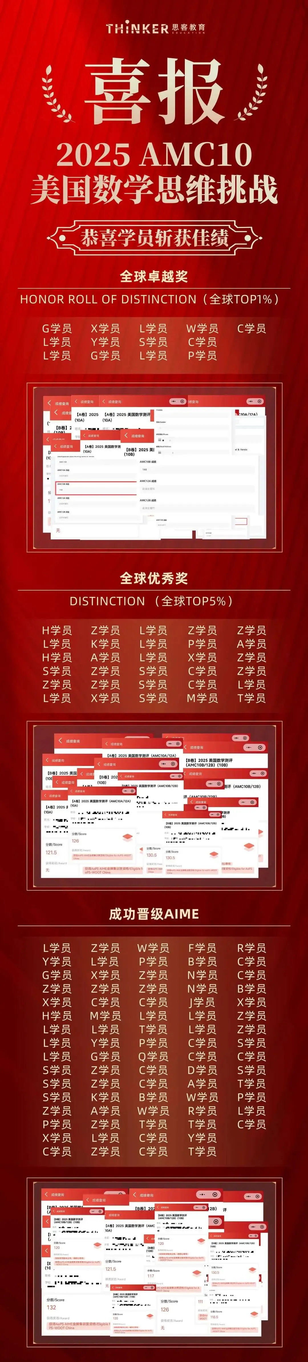 AMC10成绩被哈佛、斯坦福、MIT等顶尖学府视为衡量学生数学潜力的重要指标,全球前5%的奖项(Honor Roll)可直接写入申请材料,成为招生官眼中的“学术亮点”。