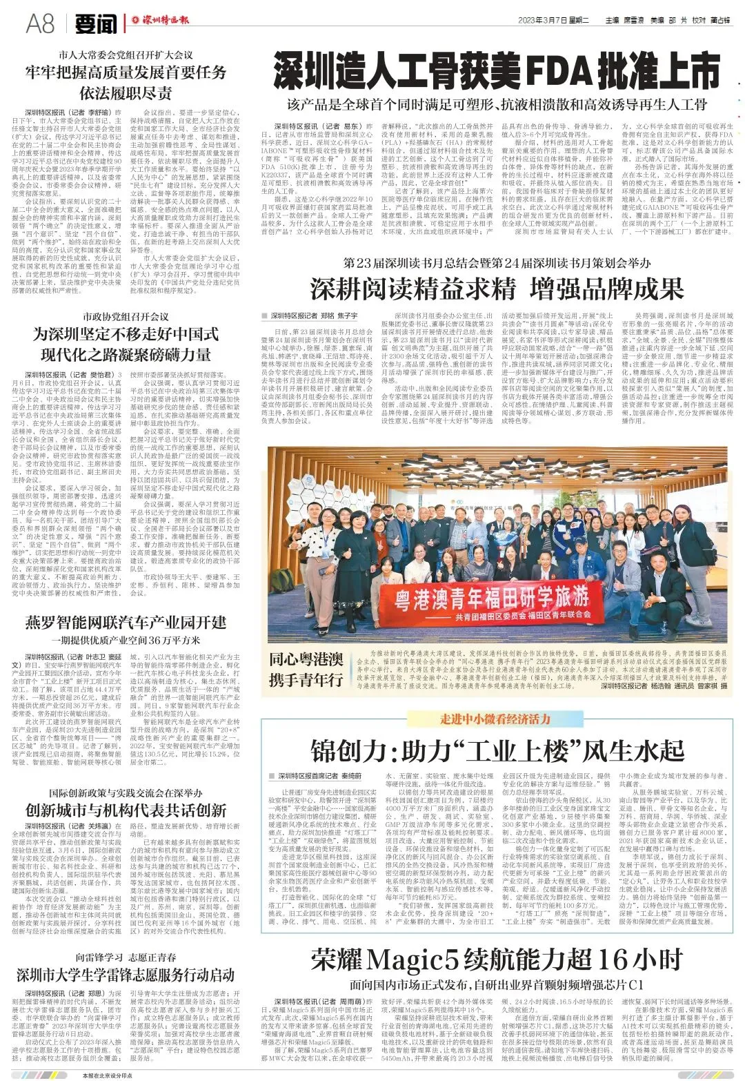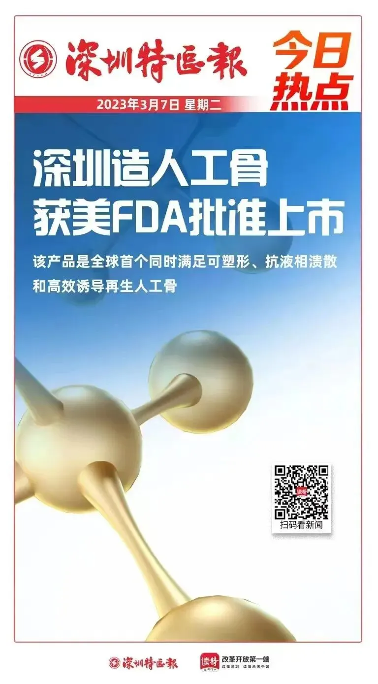 深圳特区报刊登立心科学可吸收人工骨获美FDA认证新闻3月7日,深圳特区报于要闻头条中刊登了立心科学可吸收再生人工骨获批准上市的新闻,时值两会新闻潮,深圳特区报作为权威媒体以及进入中南海的报纸之一,这一举动不仅体现深圳市对于再生材料发展的关注与重视,也体现了对立心科学科研成果的认可。作为深圳市海外高层次人才创办的本土品牌,立心由衷敬佩和感谢深圳市政府敢为天下先的务实精神,不管是公司成立之初还是我们发展的各个关键阶段,立心都得到了市区各级政府的大力支持,我们接下来要再接再厉,不断创新,继续坚持自主研发,打造全国产闭环链条,立足大湾区,攀登中国优质创新的更高峰!