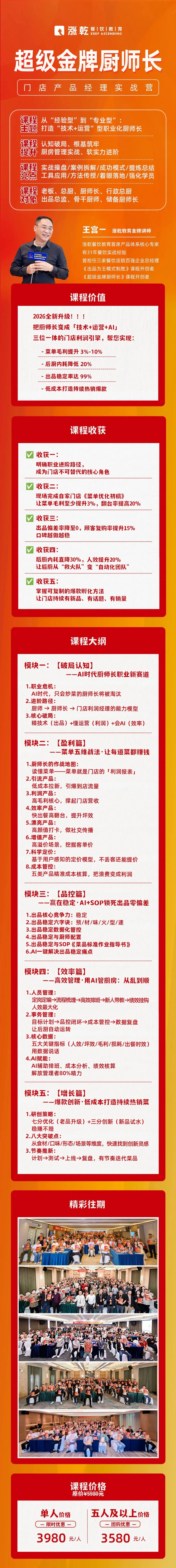 王宫一老师 ——上海涨乾餐饮教育金牌讲师、31年餐饮实战大咖、《超级金牌厨师长》《出品为王 模式制胜》课程开创者,曾执掌3家餐饮连锁百强企业总经理,本次课程聚焦2026餐饮新趋势,将「技术+运营+AI」三位一体体系化拆解,直击餐饮人核心痛点: