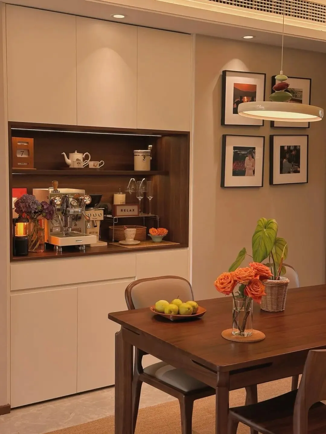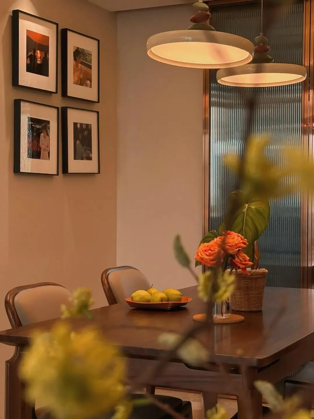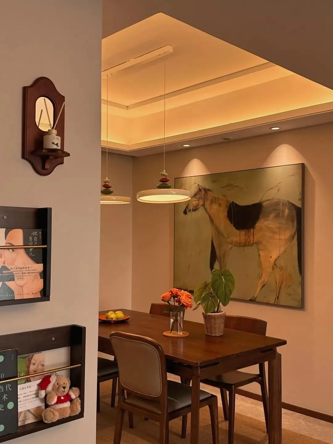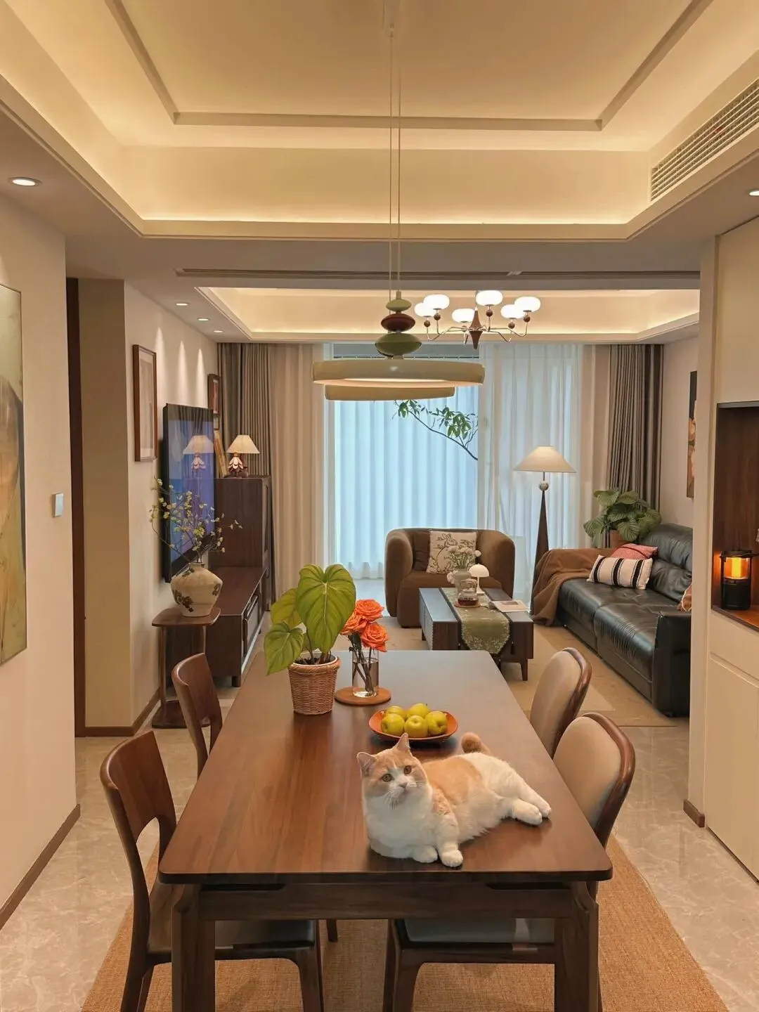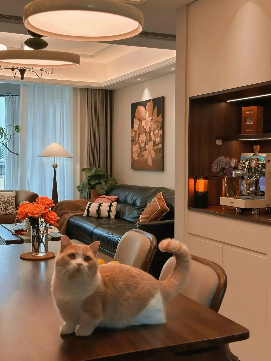 餐厅更能看出屋主的克制。桌椅线条都简单,但挂画、花、绿植、吊灯一起出现,就有了层次。不是靠摆满,而是每样东西都和木色、暖光站在一边。连猫往桌上一趴,都像这个家的一部分,不突兀,反而更有烟火气。