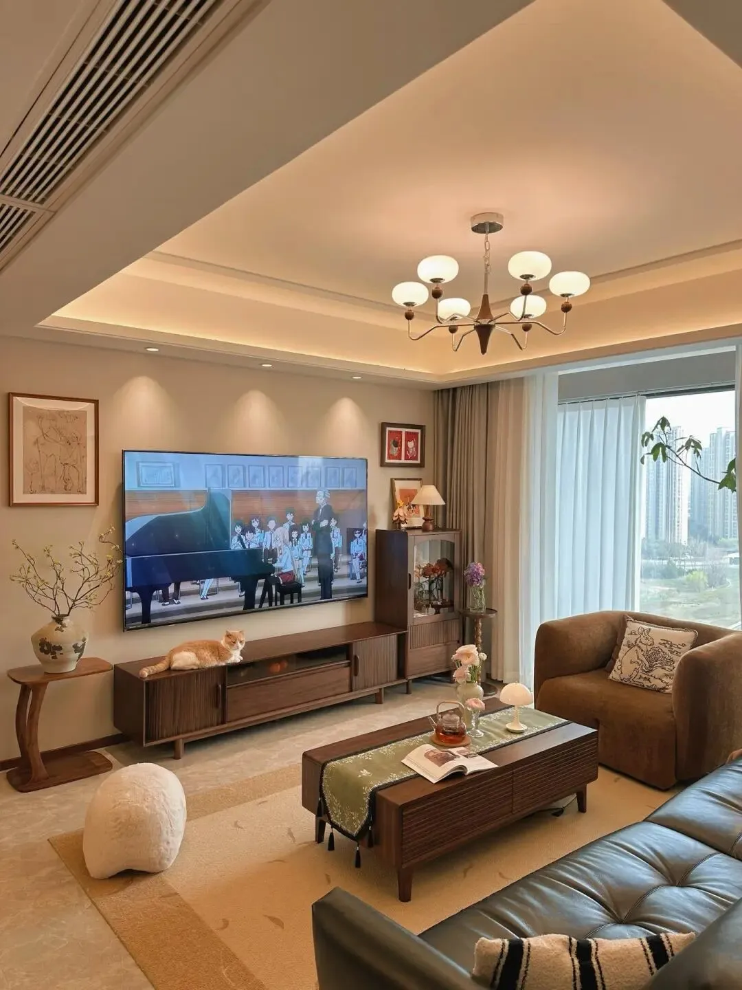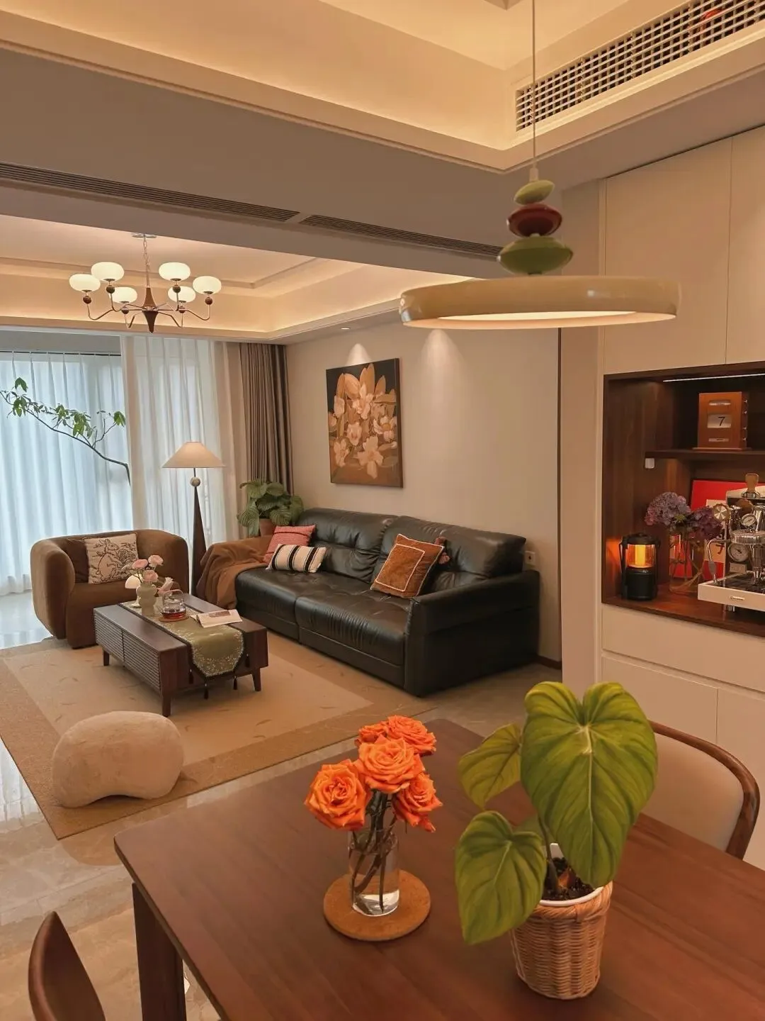 这套大概110㎡的家,最打动人的地方,就是统一。木色家具、米咖墙面、暖黄灯光,全屋像被轻轻包起来。很多人家里单品都不差,但沙发一套、灯一套、装饰画又一套,放一起就打架,这里没有。
