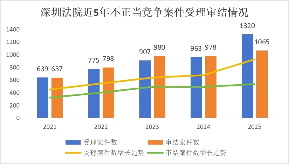 会议介绍,近年来,市中级法院深入学习贯彻习近平法治思想,落实党中央关于加强知识产权保护、维护公平竞争市场秩序的决策部署,依法妥善审理了一批社会关注度高、规则引领性强的不正当竞争案件,在明晰竞争行为边界、稳定市场主体预期、优化法治化营商环境等方面取得显著成效。2021-2025年,深圳法院共受理不正当竞争案件4604件,审结4458件,年均增长率为26.6%。