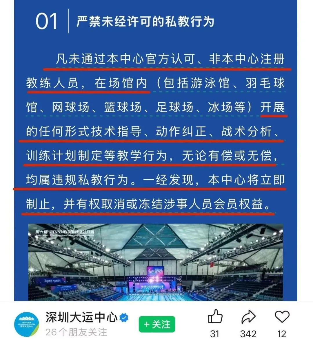 2026年4月15日,深圳大运中心通过公众号发布《深圳大运中心关于严禁私教及认准官方培训的严正声明》,将无偿的技术指导、动作纠正定性为“违规私教行为”,甚至有权取消会员权益的硬性规定,引起公众哗然。