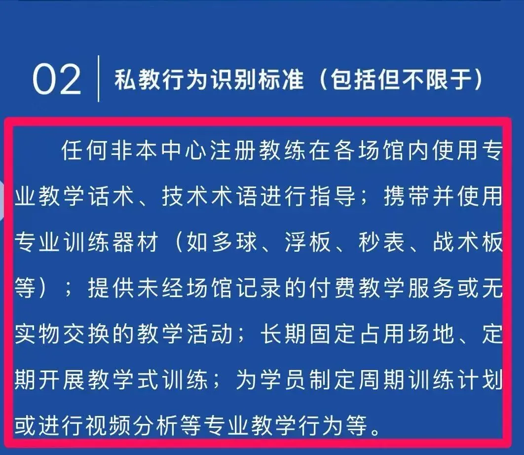 该声明首先将凡未通过大运中心注册教练人员,在场馆内(包括游泳馆、羽毛球馆、网球场、篮球场、足球场、冰场等)开展的任何形式技术指导、动作纠正、战术分析、训练计划制定等教学行为,无论有偿或无偿,均定性为违规私教行为,并声称有权取消或冻结涉事人员会员权益。