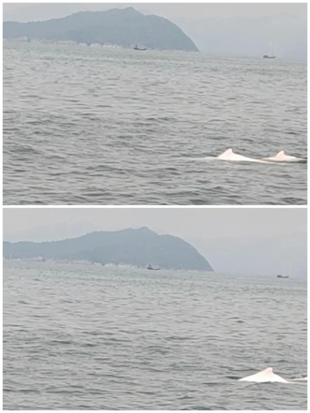 4月15日,深汕特别合作区鲘门街道百安海域再现“海洋精灵”戏水盛景,两头粉白色的中华白海豚在澄澈海面上逐浪嬉戏,引得市民游客阵阵欢呼。