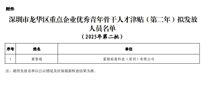 深圳市龙华区重点企业优秀青年骨干人才津贴拟发放人员名单公示(2025年第二批)