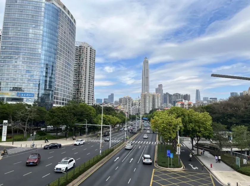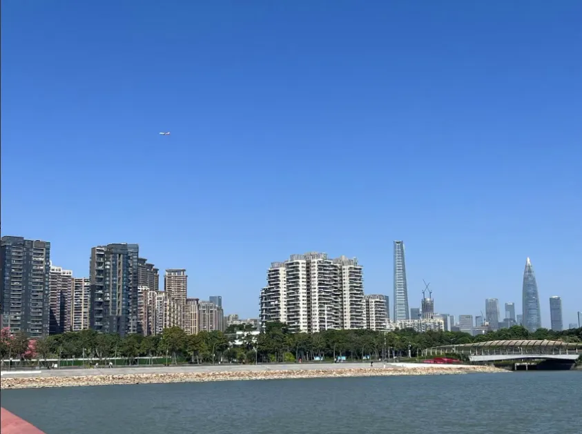 平安金融中心的尖顶刺破流云,远处深圳湾的海面漾着粼粼波光,春笋与春茧静立岸边,像两位守着时光的见证者,看着这片滩涂蜕变成如今的繁华模样。我看见几位身着工服的劳动者坐在树荫下歇脚,手里捧着的盒饭还冒着袅袅热气,他们望着对面的高楼含笑不语,或许那栋楼里,就藏着他们亲手砌就的某一块砖、某一寸钢筋。