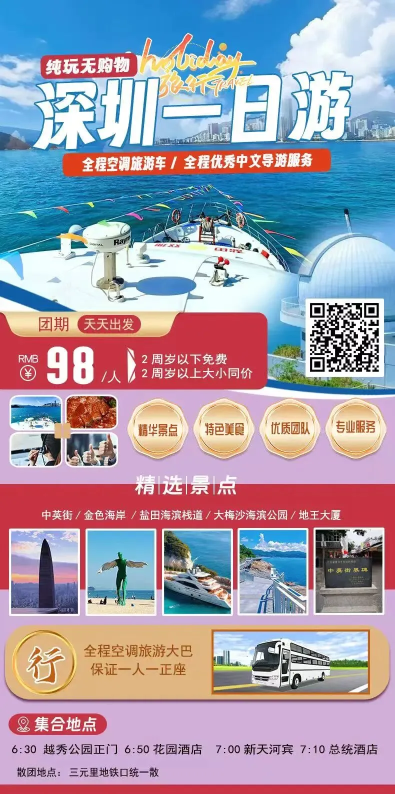 【带您游深圳】4月天天出发!广州出发!特惠98元深圳休闲观光1日游含午餐!畅游大梅沙海滨公园+中英街+地王观光+金色海岸游艇出海观光