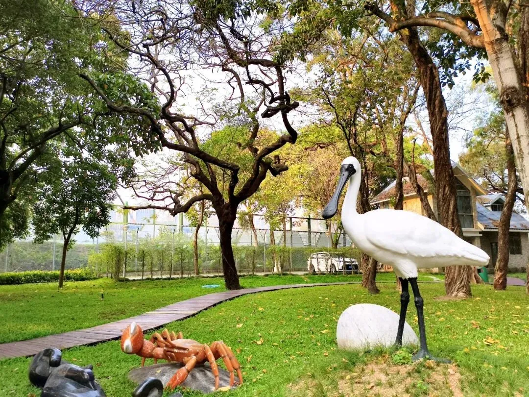 这里有个黑脸琵鹭的雕塑,栩栩如生。黑脸琵鹭是一种极度濒危的珍稀水鸟,国家一级保护动物,称为“鸟中大熊猫”,每年10月到四月,深圳湾公园就是它们温暖的栖息地。
