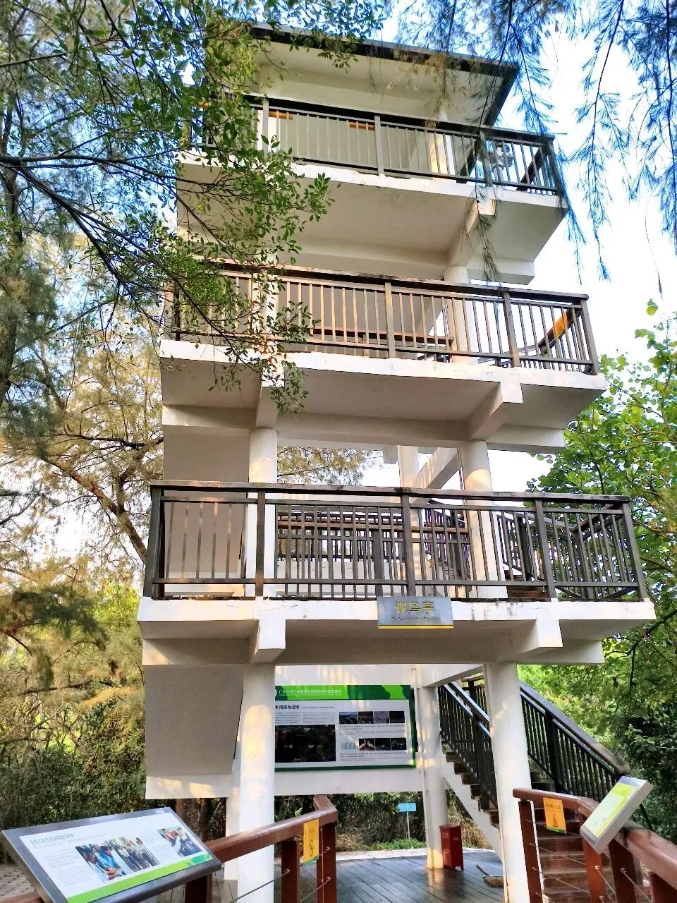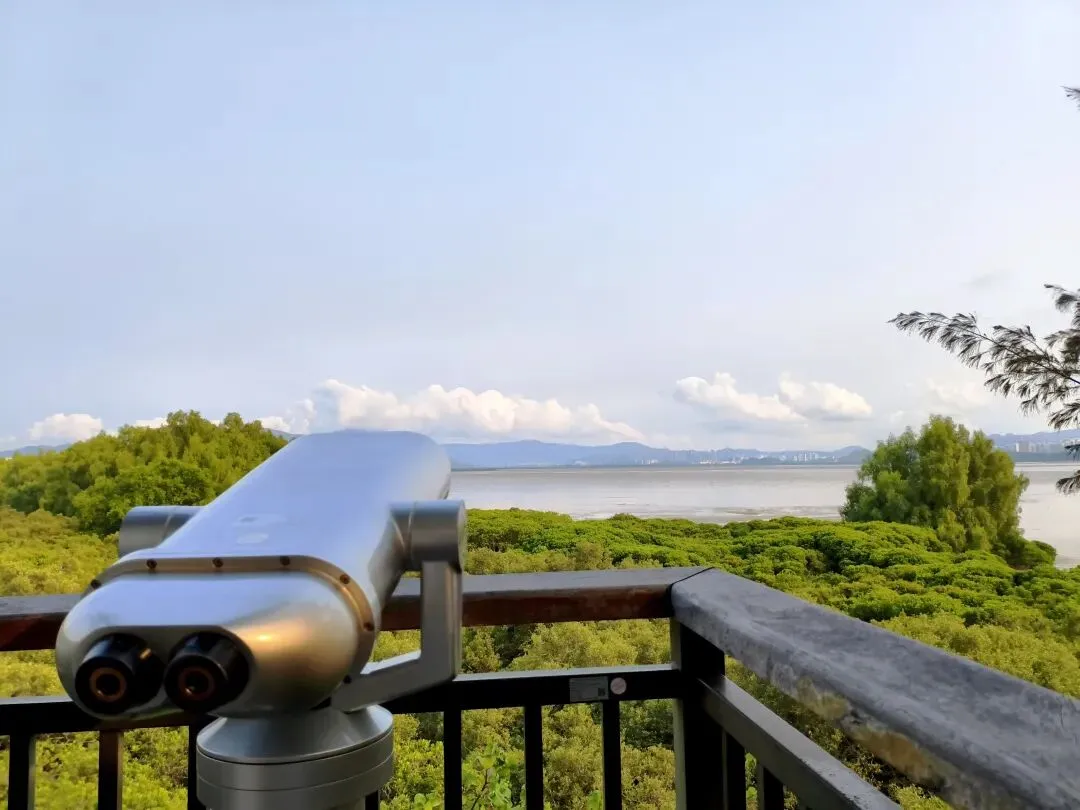 角落有个高倍望远镜,供游客观鸟。深圳湾的海就在眼前,对面是香港,在望远镜里能清晰看到香港的高楼,以及马路上行驶的车辆……这么远还能看这么清楚,感觉好神奇啊!