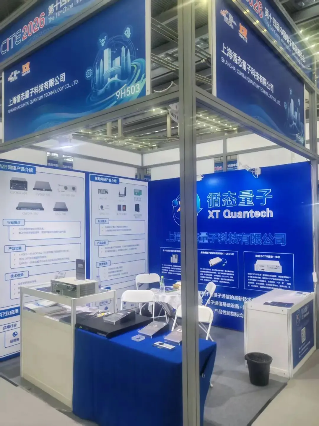 本次展会,循态量子展位以简洁大气、科技感十足的设计风格打造品牌专属形象,现场科学划分产品展示区、商务洽谈区与技术讲解区,为来访客商提供舒适、高效、专业的交流体验。展位重点陈列OTN量通一体机、量子密钥分发设备、量子随机数发生器等明星产品,系统展示了循态量子在连续变量量子密钥分发、量子安全融合通信、高安全随机数生成等方向的核心突破,直观呈现“量子+通信”一体化解决方案的成熟度与落地能力。