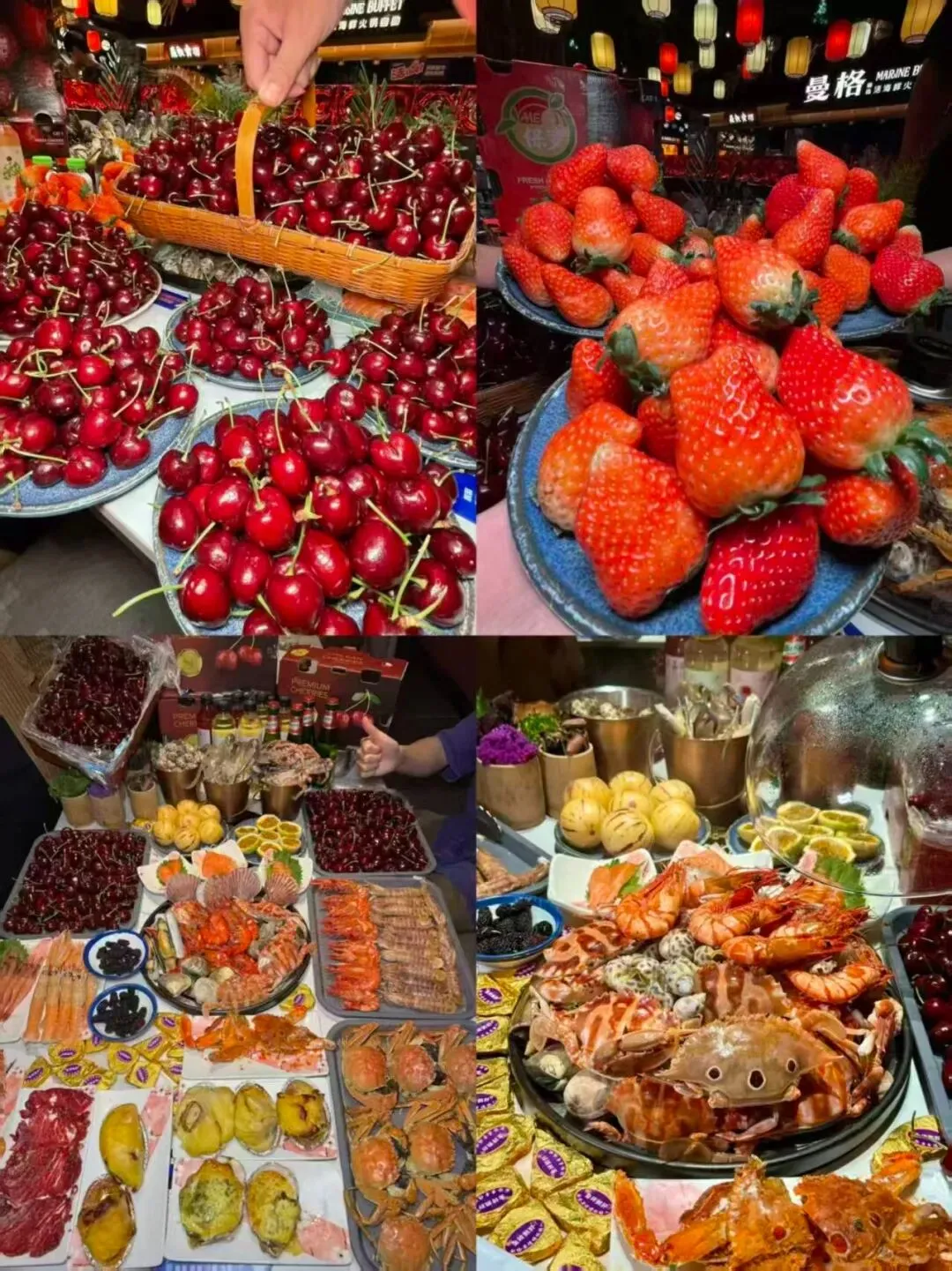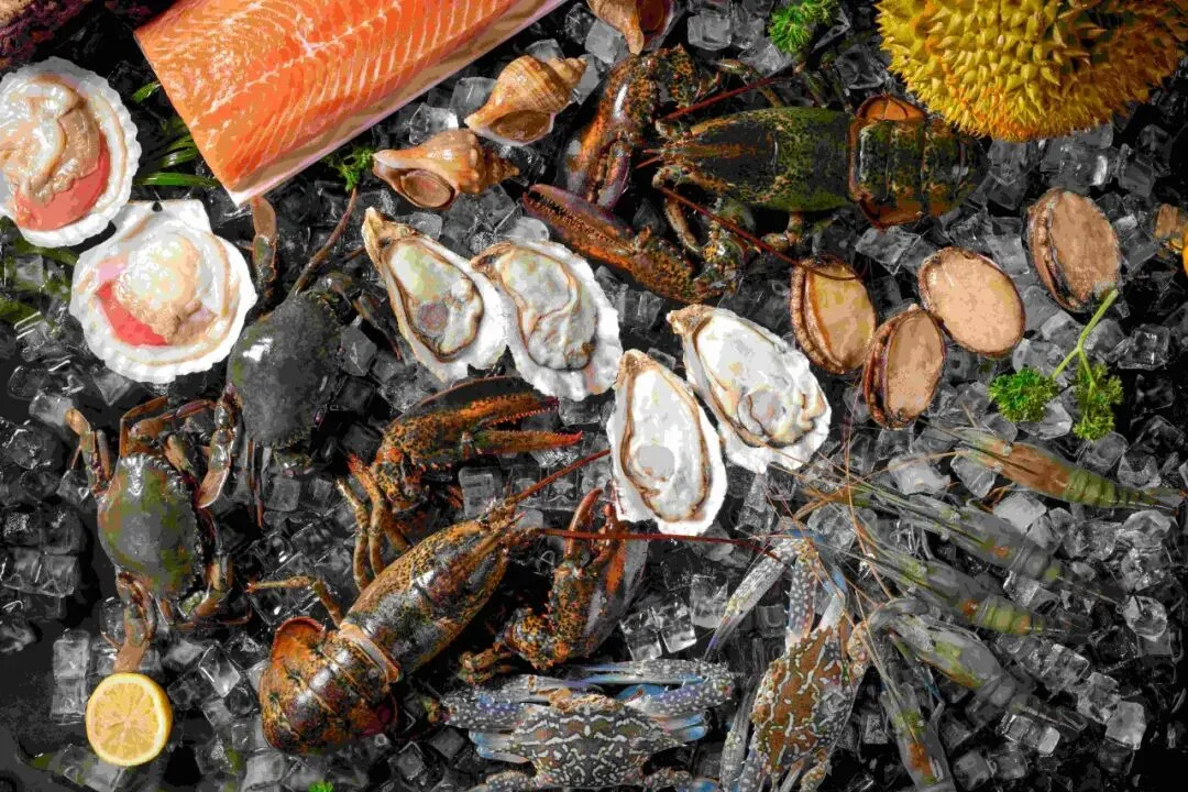 活海蟹、生蚝、鲜虾、三文鱼、榴莲、鹅肝、鳌虾…