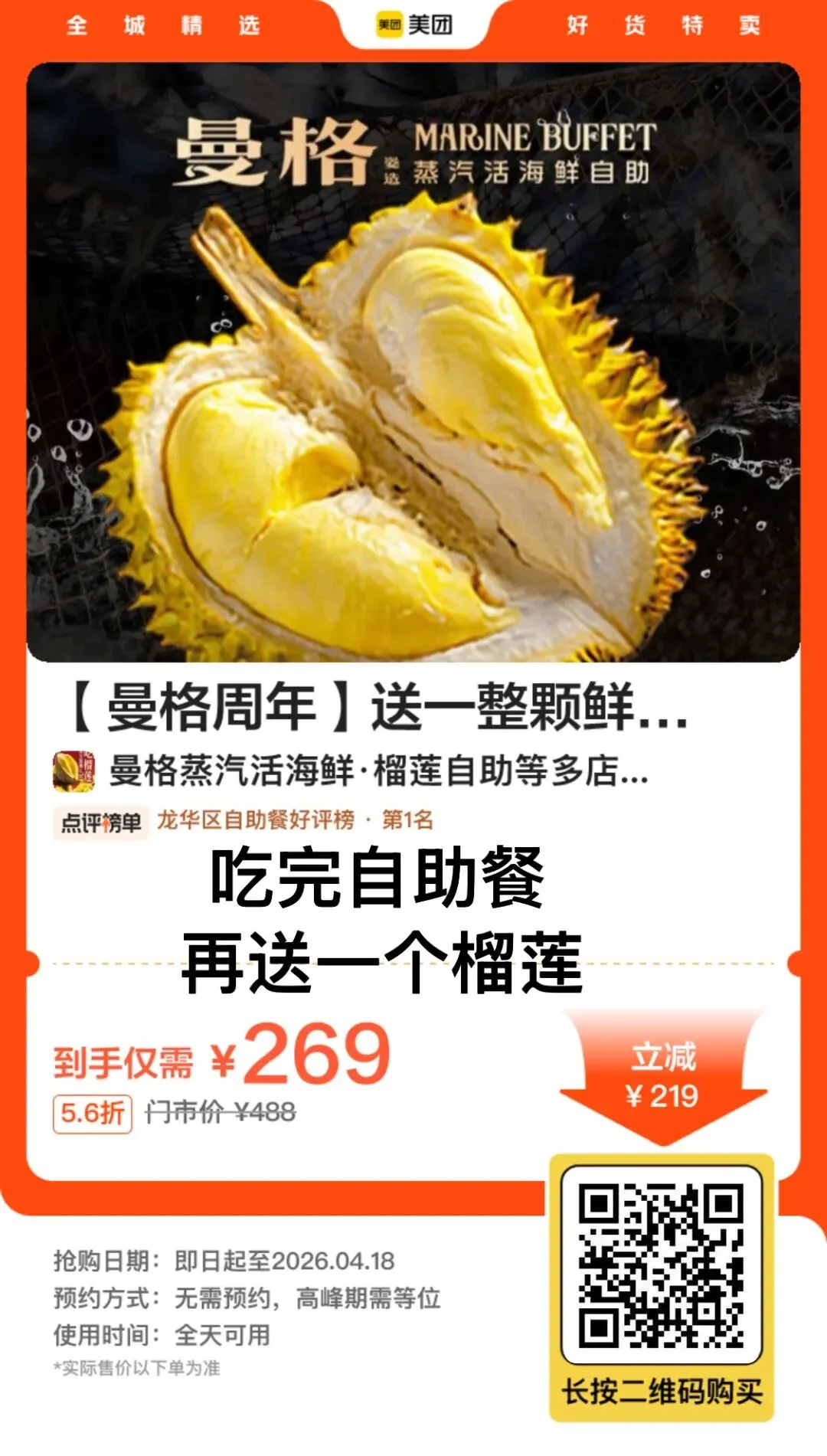 好消息,深圳知名自助餐厅【曼格活海鲜自助餐】推出超级活动,吃自助餐送整个榴莲,整个打包提走。喜欢吃的赶紧囤起来,过期自动退,不用随时可以退。